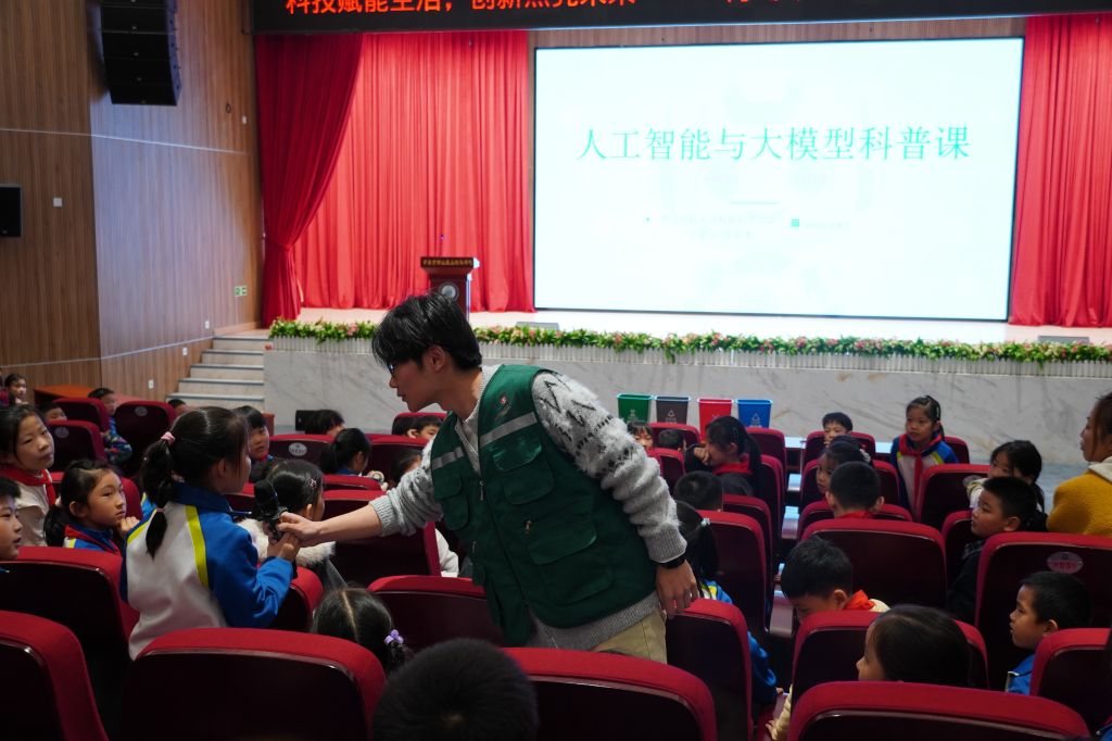 活动伊始,志愿者围绕垃圾分类开展宣讲,用浅显易懂的语言,引导学生树立绿色低碳、文明环保的生活理念,筑牢生态环保意识。随后,志愿者聚焦人工智能与大模型领域开展科普宣讲,结合生活实际案例拆解专业知识,穿插互动问答环节,充分激发学生的学习热情,营造出浓厚的课堂学习氛围。