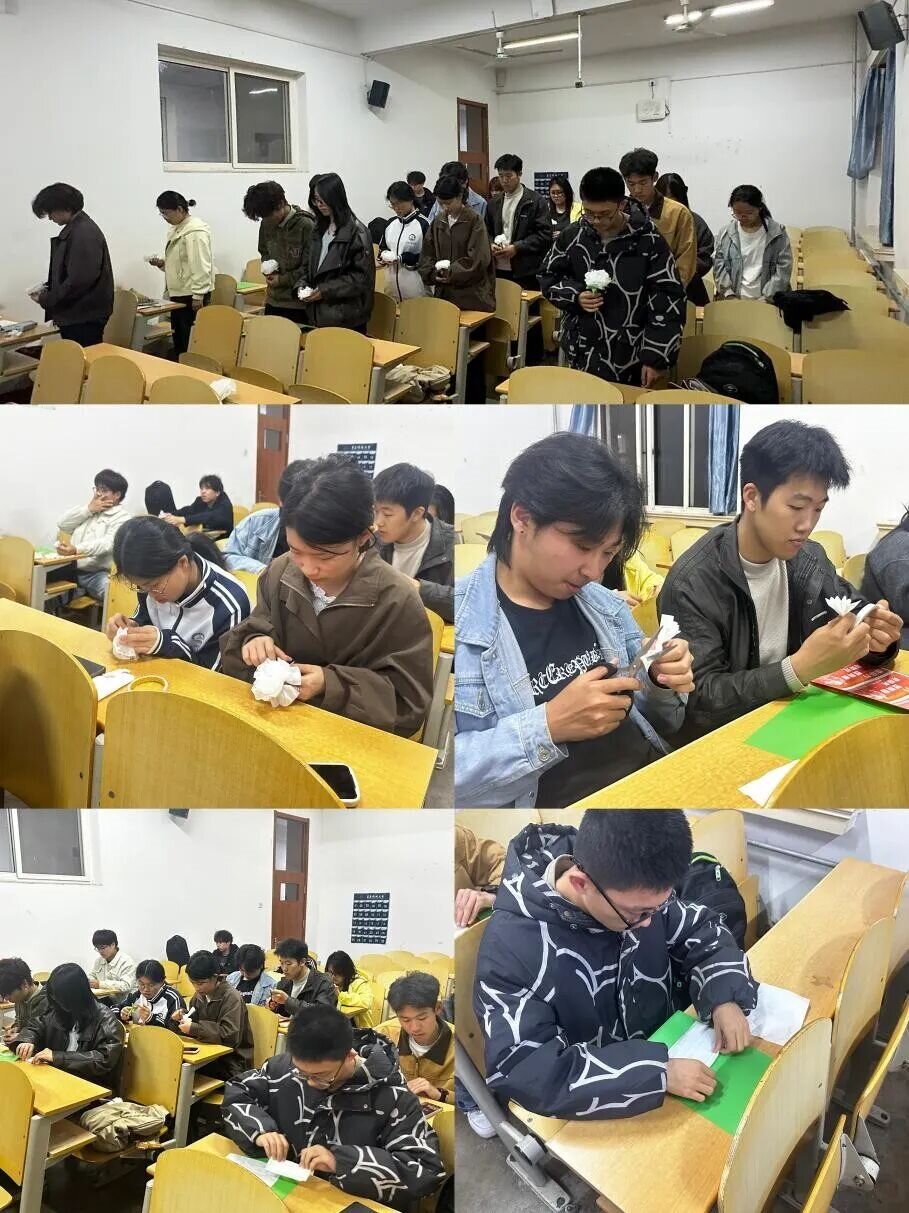 学院团委组织现场手工制作白色纸花活动,同学们亲手折叠白花,以质朴心意寄托对英烈的缅怀。制作完毕后,全体人员手持白花整齐肃立,集体低头默哀,以无声的敬意缅怀革命先烈,表达深切悼念与崇高敬意。