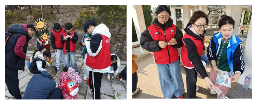 活动当天,志愿者们准时集合,在机构负责人的指导下领取志愿马甲、布置活动场地,有序完成打卡点布置、指示牌悬挂、场地引导等筹备工作。