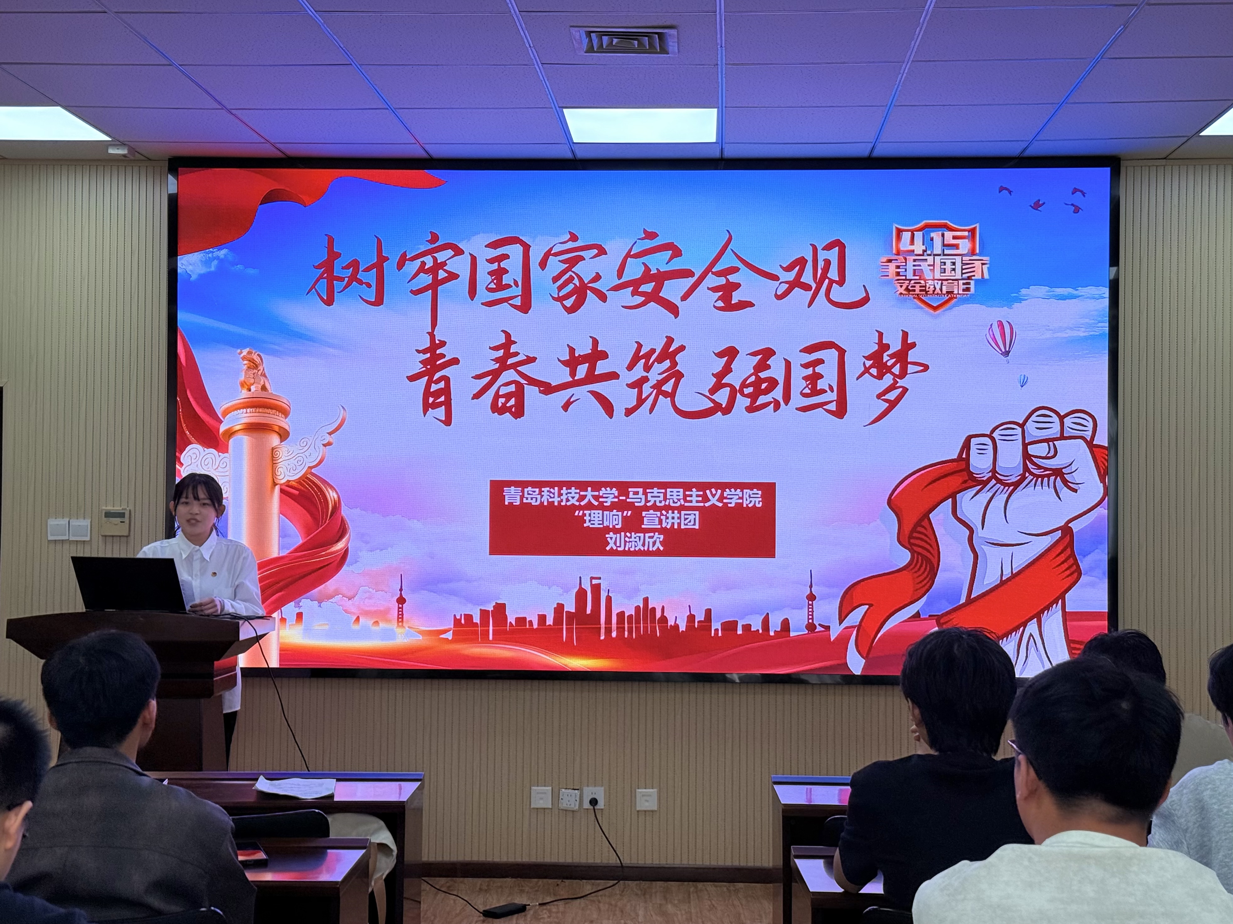 活动中,刘淑欣以“树牢国家安全观 青春共筑强国梦”为主题进行宣讲。她从总体国家安全观的核心内涵切入,系统阐释了国家安全的丰富内容和时代意义;随后结合国际热点事件,引导同学们认识国家安全底线;并围绕新时代国家安全面临的内外部挑战,强调青年学生应坚定理想信念、严守行为底线。