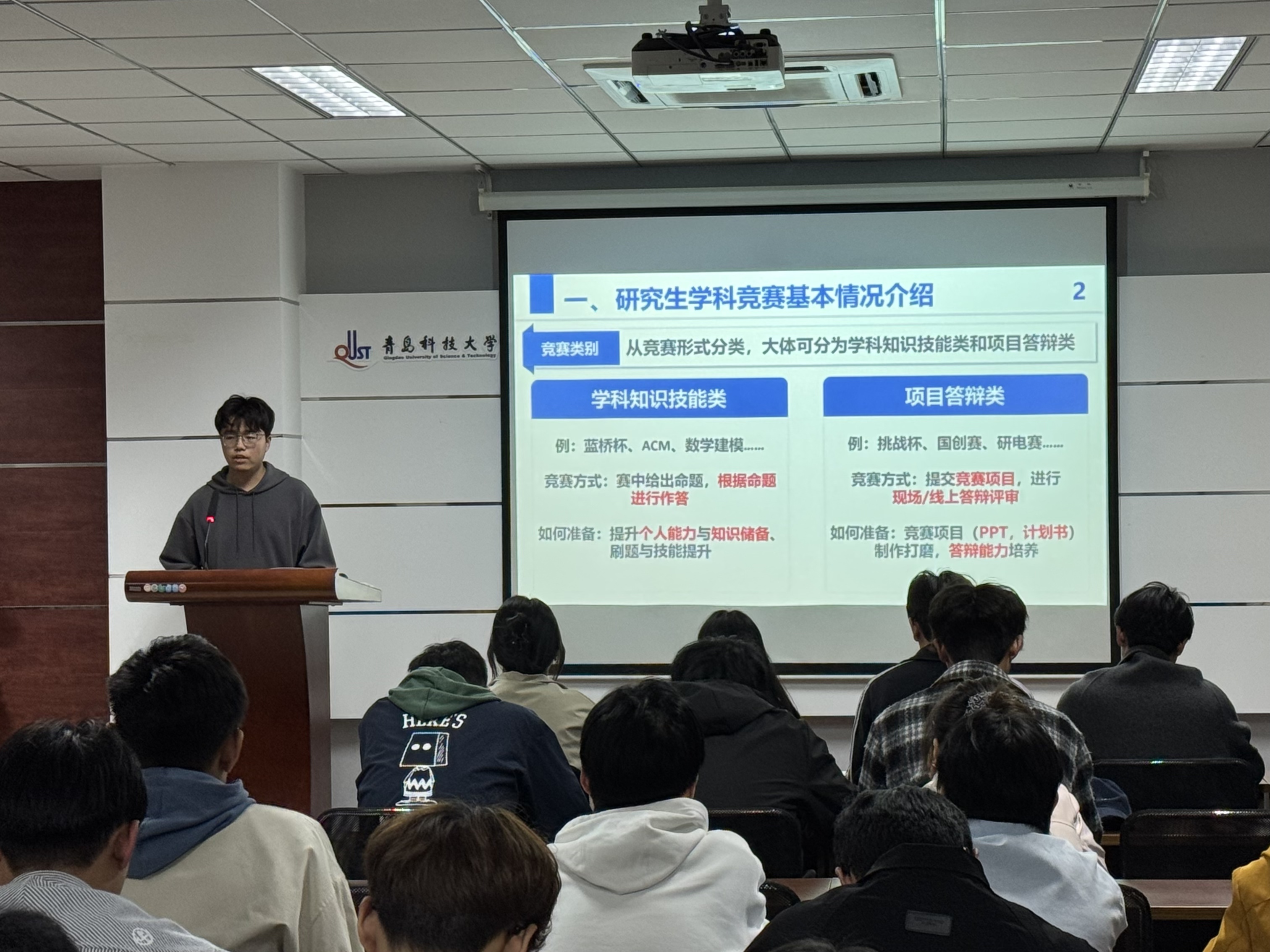 首先,信息科学与技术学院孟书宇讲解了如何使用人工智能技术赋能学科竞赛。介绍研究生学科竞赛的基本情况,结合人工智能技术分享了项目类学科竞赛的备赛方法,他指出,竞赛项目打造需要从自身研究方向入手,找出实际应用场景,总结问题。