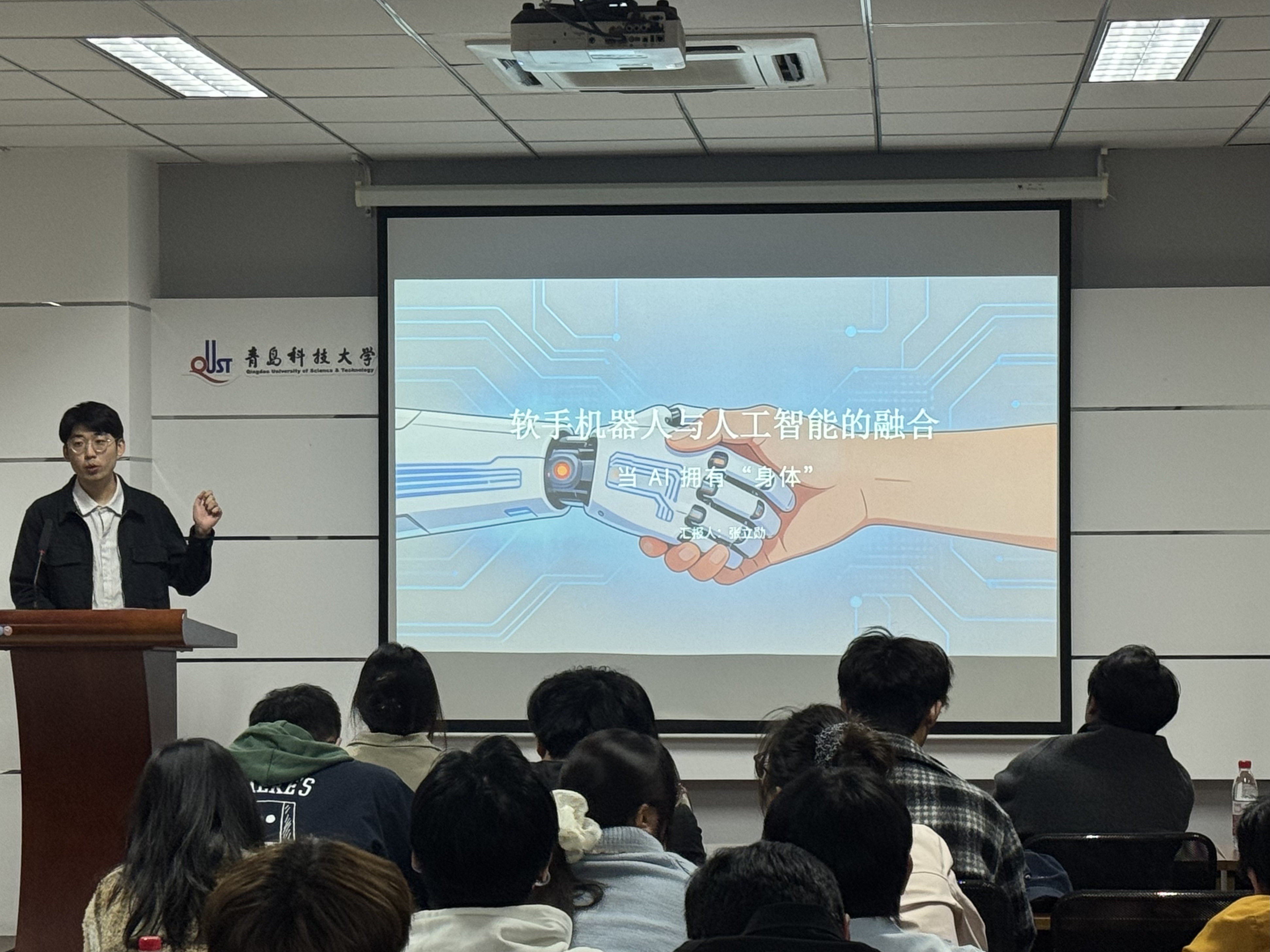 最后,自动化与电子工程学院张立勋从人工智能的视角出发,介绍了软体机器人技术。从视觉感知、触觉感知和多模态感知三方面讲解机器人的智能感知策略,结合强化学习思想介绍了机器人“自主思考”的方式,并结合案例指出具身智能技术与软体机器人“天生一对”,具有天然的契合度。