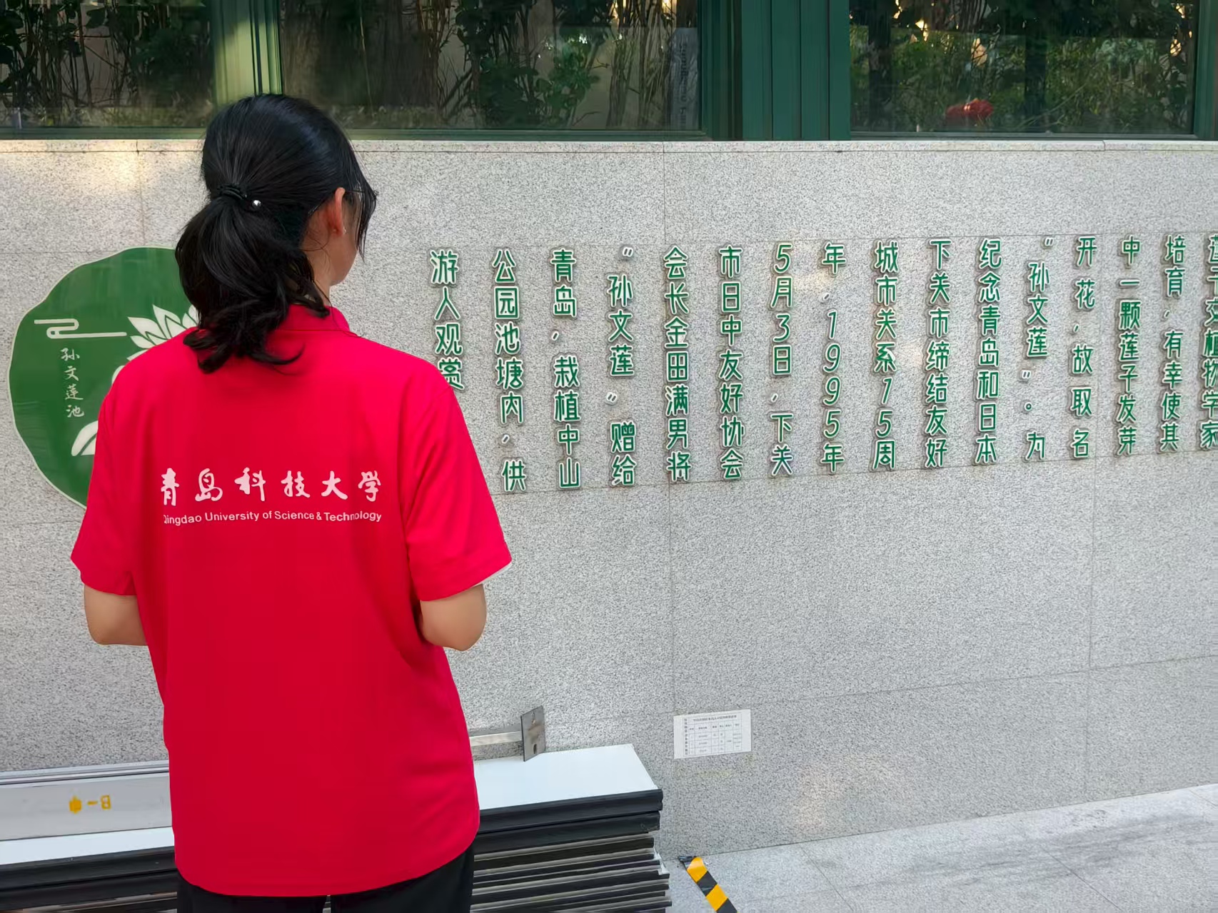 随后,实践队循着扶梯,了解了“孙文莲”的故事。1995年,日本下关市日中友好协会为庆祝两市缔结友好城市25周年,将孙中山先生手赠的莲子育成“孙文莲”,移栽于中山公园池塘内。在池畔边,应数242班齐宁静领诵《采莲曲》,其他队员跟诵——“荷叶罗裙一色裁,芙蓉向脸两边开”,在“出淤泥而不染”的意境中体悟廉洁品格的跨文化共鸣。