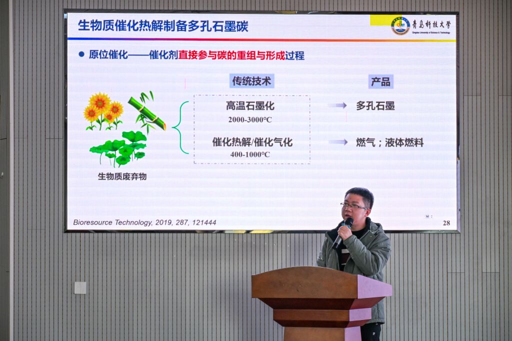 张涵以“功能生物炭的形成机理及其定向调控机制研究”为题,系统阐述生物质高值化利用的前沿进展。他重点介绍了生物质催化热解技术,通过杂原子掺杂与金属负载,制备多孔石墨碳、氮掺杂生物炭等功能材料,广泛应用于CO₂捕集、电催化及污水处理等领域。报告内容深入浅出,兼具理论深度与应用价值,为在场师生拓宽了生物质资源低碳转化的新思路,激发了大家对绿色能源材料研究的浓厚兴趣。