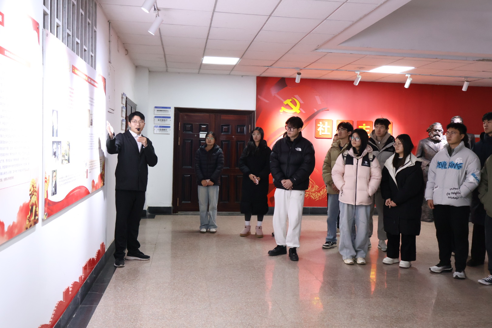 马克思主义学院“理响”宣讲团成员秦士河、高原作“社会主义五百年”展板宣讲。秦士河、高原清晰地梳理了社会主义从空想到科学、从理论到实践、从一国实践到多国发展、从遭遇挫折到中国特色社会主义焕发蓬勃生机的宏大历史进程。展板宣讲为同学们深刻认识社会主义发展的曲折性与必然性,理解中国特色社会主义的历史逻辑、理论逻辑和实践逻辑,为深入学习贯彻党的最新理论成果奠定了坚实的历史与思想基础。