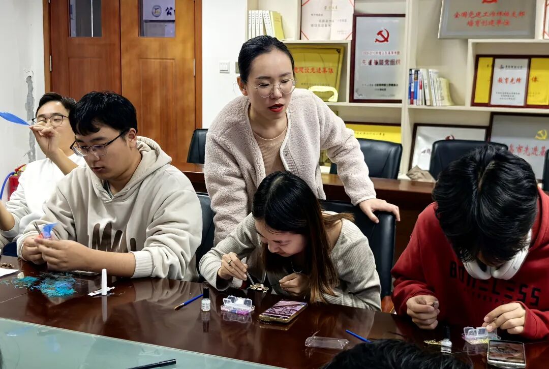 活动伊始,刘敏为同学们解读非遗手作的文化内涵与实践意义:点翠的流光、螺钿的璀璨、烧蓝的雅致,都是古人用智慧凝结的美学结晶。非遗手作不仅是技艺的传承,更是慢下来感受细节、沉淀心性的过程,这与科研中精益求精、潜心钻研的精神不谋而合。她鼓励同学们在动手实践中感受传统工艺的魅力,在专注创作中疏解科研压力。