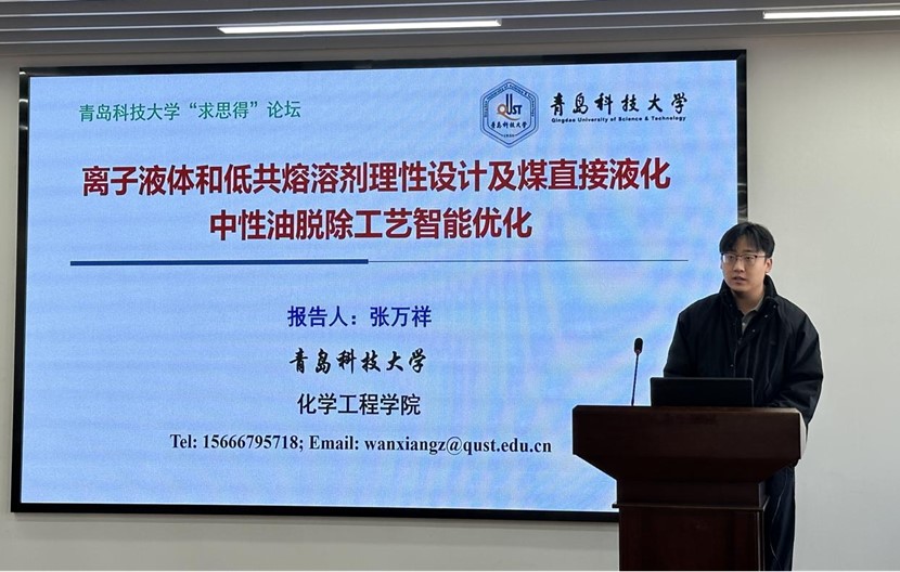 2025年12月12日上午9时,青岛科技大学化工学院“求思得”论坛在CCF楼814学术报告厅成功举办。本次论坛特邀我校特聘副教授张万祥老师作题为“离子液体和低共熔溶剂理性设计及煤直接液化中燃油脱除工艺智能优化”的专题学术报告,吸引了百余名研究生参加。