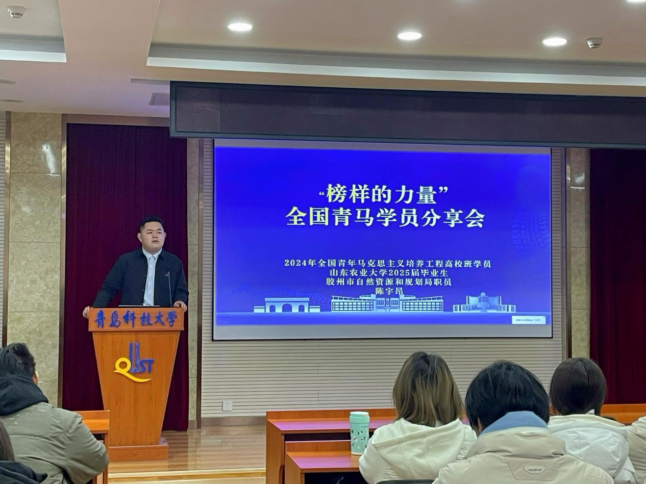 为深入学习贯彻党的二十届四中全会精神,充分发挥青年马克思主义者培养工程的示范引领作用,引导广大青年学子坚定理想信念、勇担时代使命,12月13日,信息学院团委在402会议室举办“榜样的力量——全国青马学员分享会”主题团课。活动特邀2024年全国青年马克思主义者培养工程高校班学员、胶州市自然规划局陈宇昂作专题分享。学院青马工程全体学员共计80余人参加本次团课。