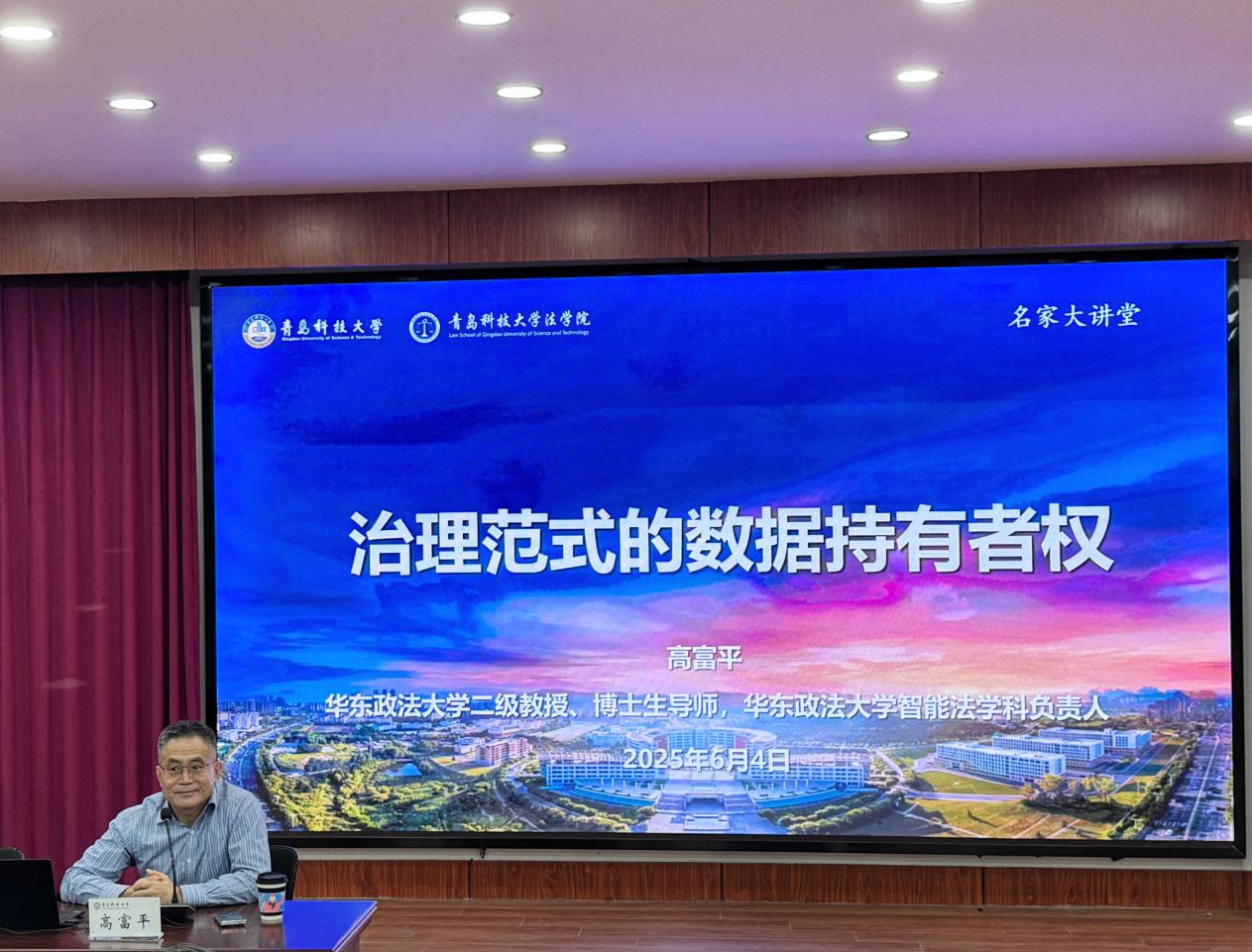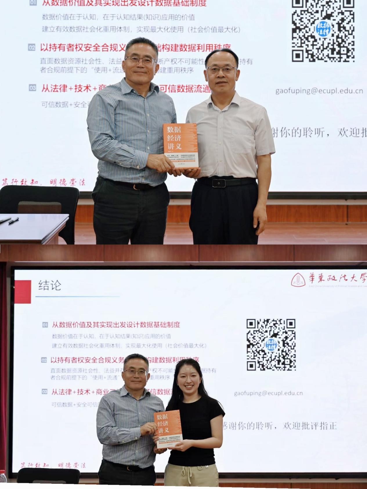 讲座尾声,高富平还向青岛科技大学法学院以及现场一位提问的硕士研究生分别赠予了其研究数据法的专著,勉励大家深入研究。
