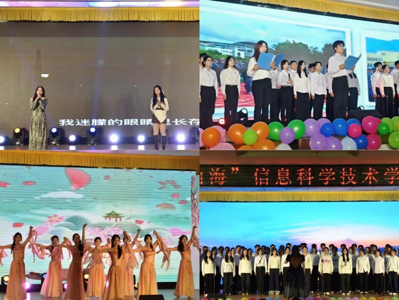 歌曲《这世界有那么多人》以温柔的声线将人间的温暖娓娓道来;朗诵《信·青春志》以铿锵的誓言展现出新一届信息学院班干部的精神风貌;《苏幕遮》的舞者们以轻盈的舞步、优美的身段勾勒出江南水乡的朦胧诗意,一颦一笑间尽显古典之美;合唱《龙的传人》气势恢宏,整齐嘹亮的歌声唱出了炎黄子孙的骄傲与自豪。