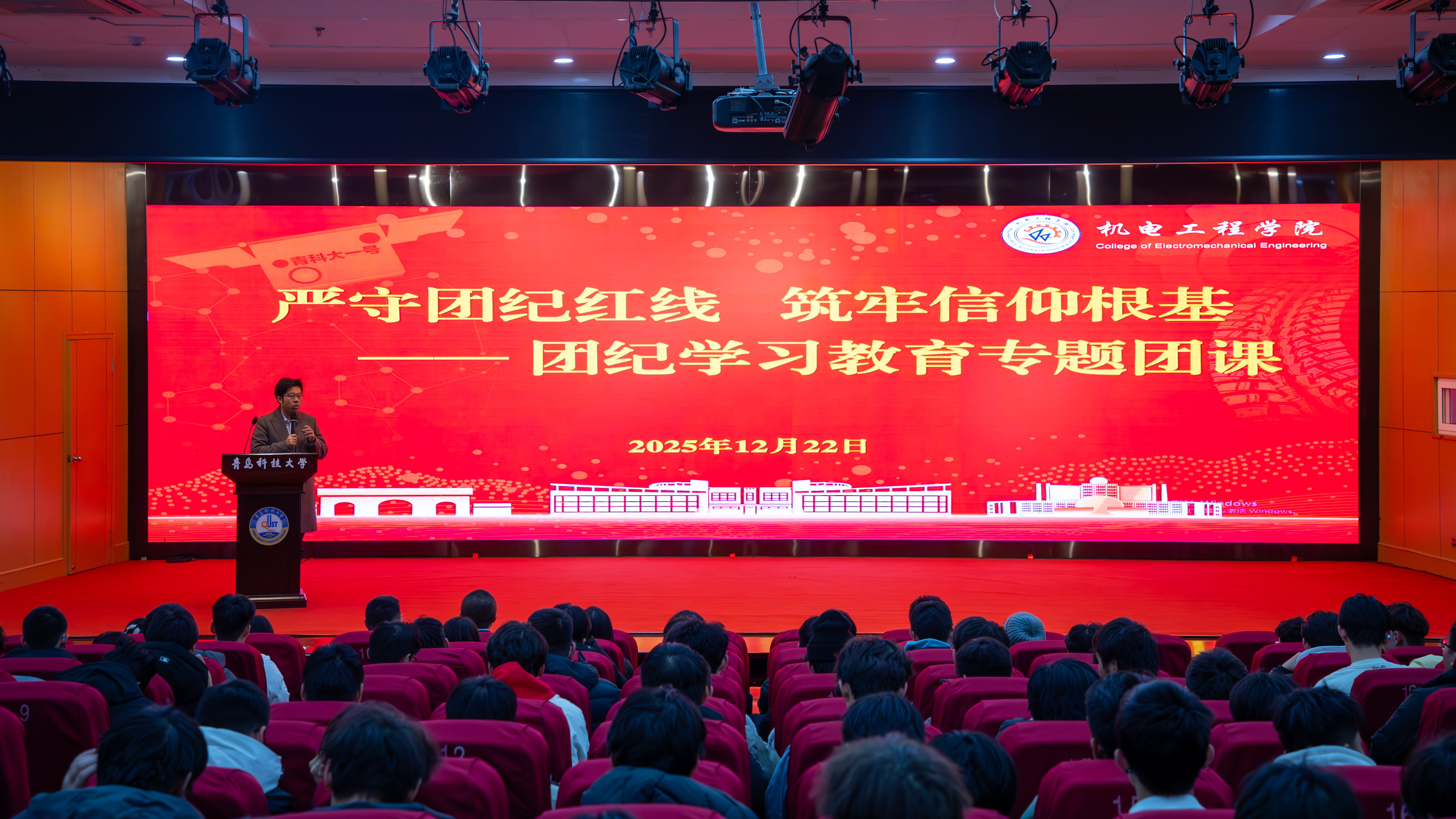 为强化青年学生纪律意识,筑牢理想信念根基,12月22日,机电工程学院团委在英科报告厅召开“严守团纪红线 筑牢信仰根基”团纪学习教育专题团课。学院团委副书记于超、2025级学生骨干、入团积极分子及青马工程学员代表参加本次学习。