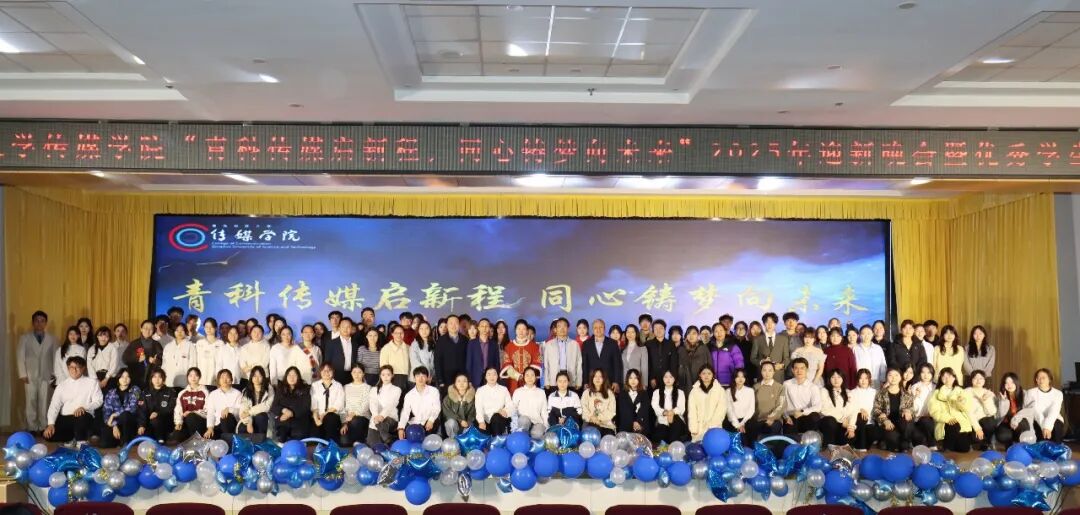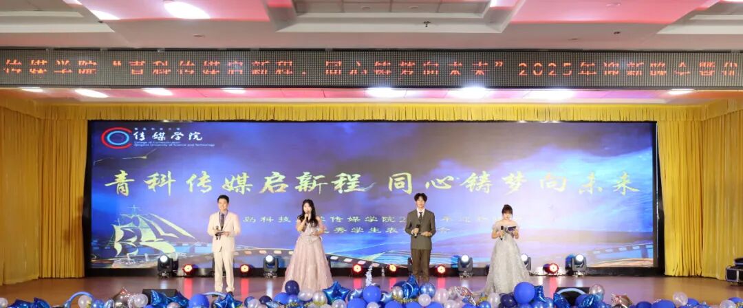 近日,传媒学院“青科传媒启新程,同心铸梦向未来”2025年迎新晚会暨优秀学生表彰大会在崂山校区第二报告厅举办。传媒学院党委书记孙洪广、副院长(主持工作)石晨旭、原中层副职干部钟兆秀、党委副书记兼副院长刘海波、副院长庄莹,传媒学院2009届编辑出版学专业校友青岛君巍创业投资公司总经理王振乐、合伙人潘子犇,学院相关部门负责人、系主任、班主任代表、辅导员和在校生共计400余人共赴这场青春盛宴,在光影与歌声中见证传媒学子的成长与绽放。