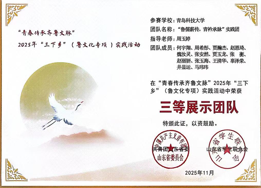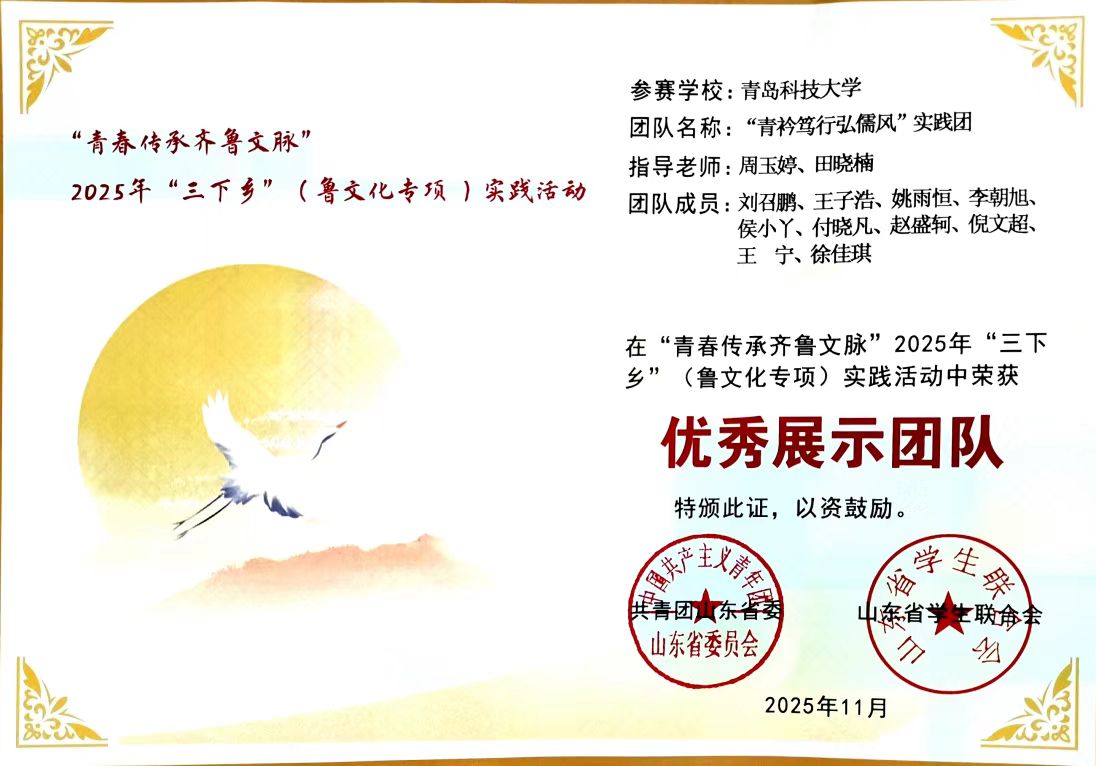 近日,共青团山东省委、山东省学生联合会主办的“青春传承齐鲁文脉”——山东省2025年“三下乡”专项实践活动评选结果正式揭晓,环境学院“鲁儒薪传,青衿承脉”实践团和“青衿笃行弘儒风”实践团,从省内外643个团队中脱颖而出,入选“鲁文化专项”重点团队,分别荣获省级三等展示团队和优秀展示团队荣誉称号,以青春之力为齐鲁文脉传承注入鲜活动能。