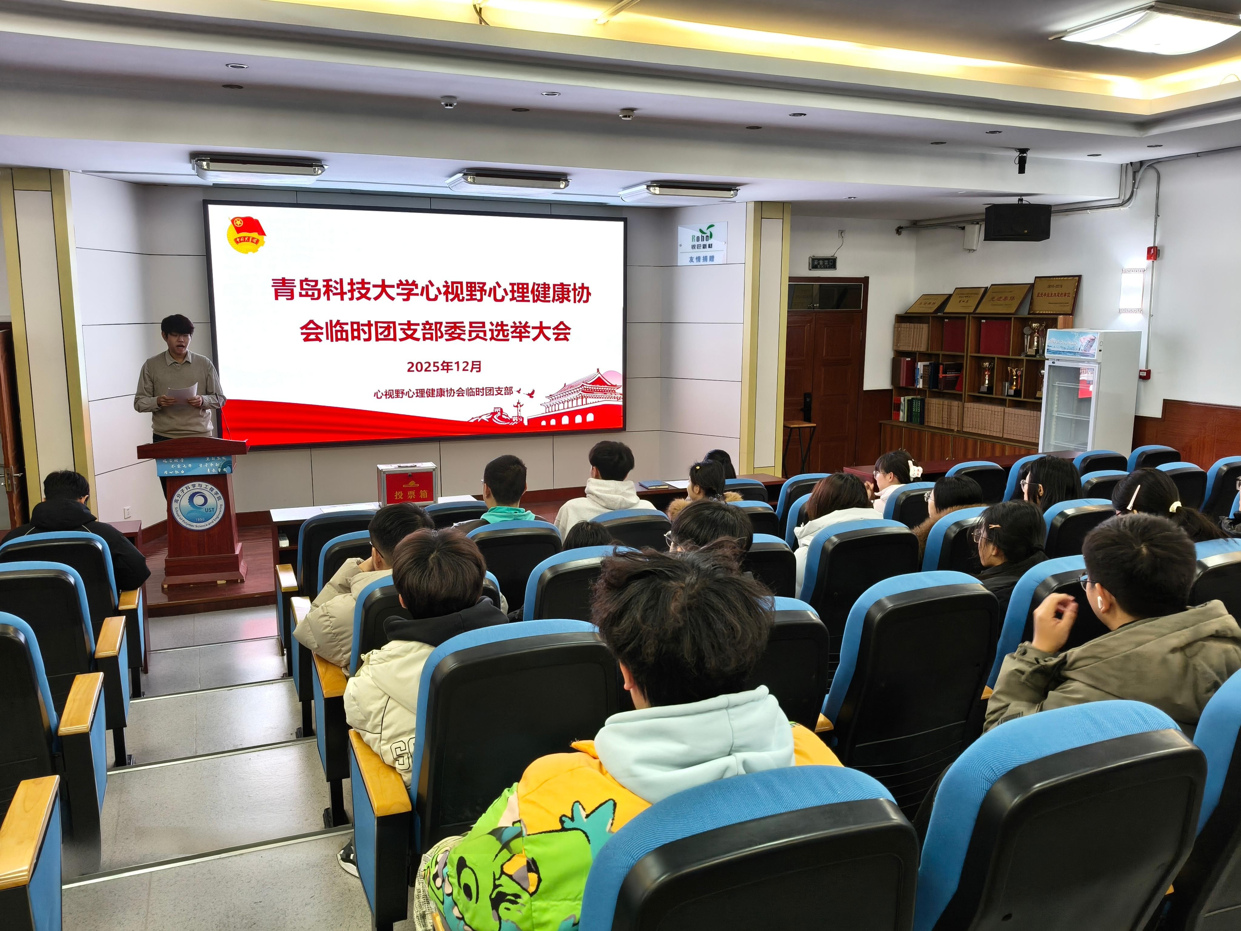 为深入贯彻落实《高校学生社团建设管理办法》及《中国共产主义青年团支部工作条例(试行)》等文件精神,进一步强化学生社团的组织建设,充分发挥社团在育人工作中的积极作用,经青岛科技大学心视野心理健康协会申请、校团委批准,协会正式成立临时团支部,并于2025年12月26日在学院401会议室顺利召开临时团支部委员会选举大会,为协会发展注入新的组织活力与青春力量。
