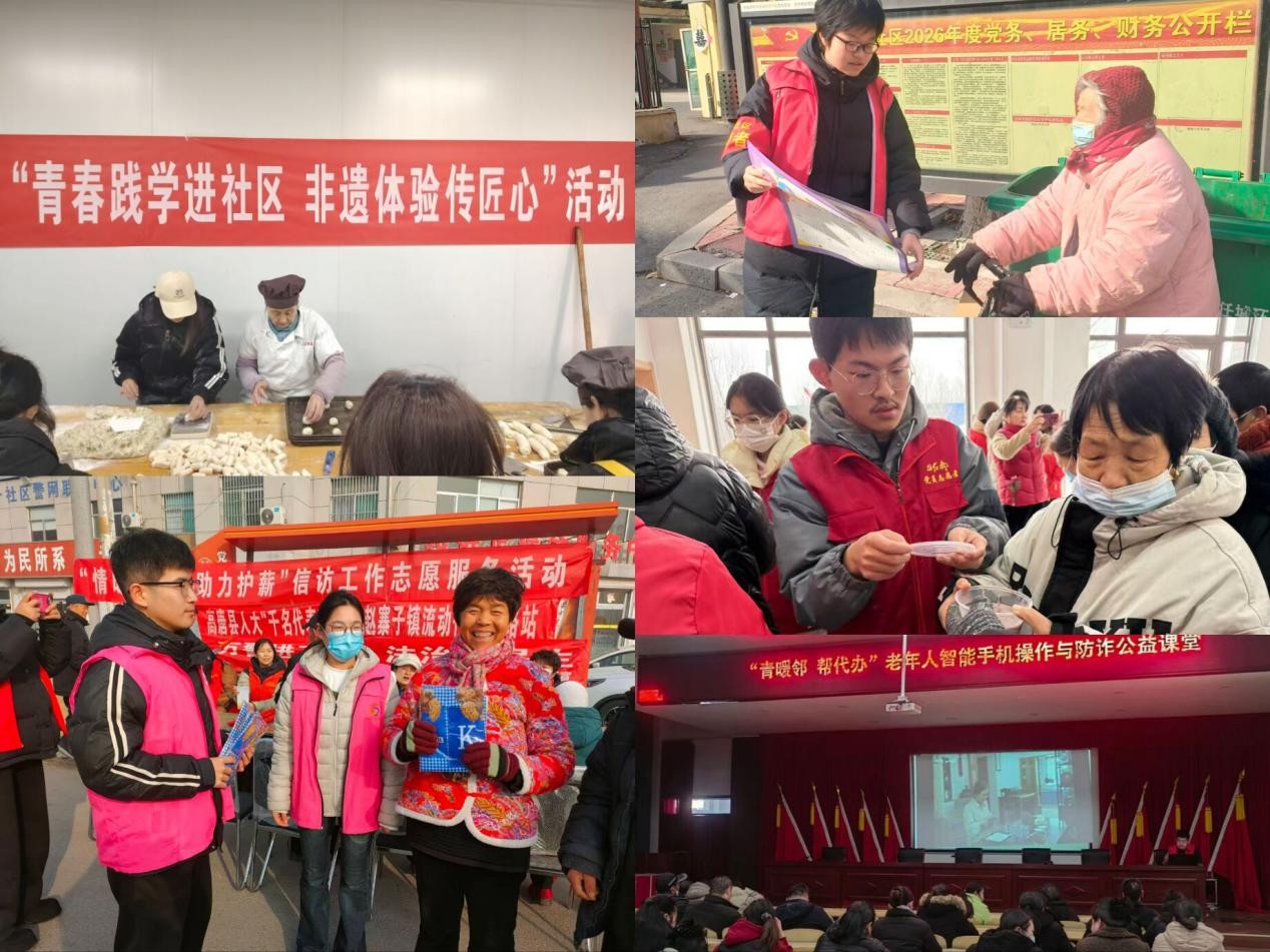 为深入学习贯彻习近平总书记关于弘扬雷锋精神的重要指示精神,引导广大团员青年在社会实践中受教育、长才干、作贡献,2026年寒假期间,信息学院团委精心部署、广泛动员,组织全院团员青年积极投身学雷锋志愿服务、“青鸟计划”实习实践、“暖冬行动”等系列活动。广大青年学子以脚步丈量大地,以行动诠释担当,身影遍布城乡基层、街头巷尾,在躬身实践中传承雷锋精神,在无私奉献中彰显新时代青年的青春风采与责任担当。