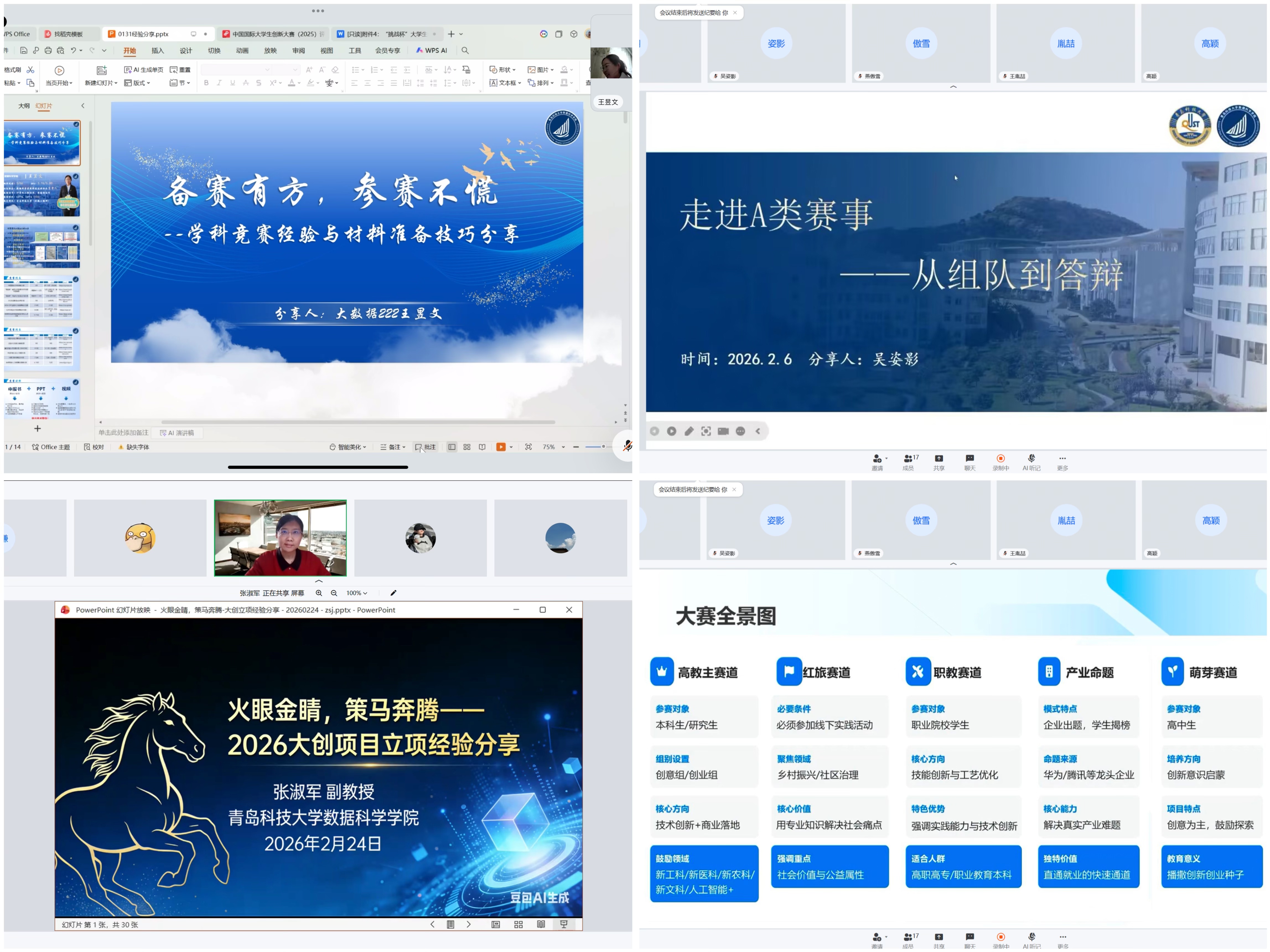 本次科创训练营精准对接学子备赛痛点与成长需求,精心规划分享内容、汇聚优质指导力量,构建起全维度、多层次的备赛指导体系。四期分享内容各有侧重、层层递进,精准适配不同阶段科创爱好者的需求,实现靶向赋能:学院科技创新协会负责人、2022级本科生王昱文带来《备赛有方·参赛不慌》学科竞赛入门分享,为科创新手梳理入门路径、破解入门瓶颈,帮助大家快速建立对科创赛事的认知;本科生专业导师、专业负责人李雪莹聚焦《“挑战杯”中国大学生创业计划大赛备赛与推进》,深度拆解赛事规则、剖析备赛逻辑,助力学子掌握科学备赛方法;本科生专业导师、上届省A类赛事省金指导教师高颖以《中国国际大学生创新创业大赛深度解析与实战指南》为主题,解读最新竞赛政策、分享实战技巧,为学子们明晰备赛方向;A类赛事国银参赛者、省金团队负责人、2022级本科生吴姿影通过《走进A类赛事:从组队到答辩》,用亲身经历分享组队搭配、答辩展示的加分秘籍,让干货经验可学可用;本科生专业导师张淑军则以《火眼金睛策马奔腾-2026大创项目立项经验分享》,为学子们指点大创项目立项方向,细致拆解常见认知误区,助力大家高效推进项目立项。