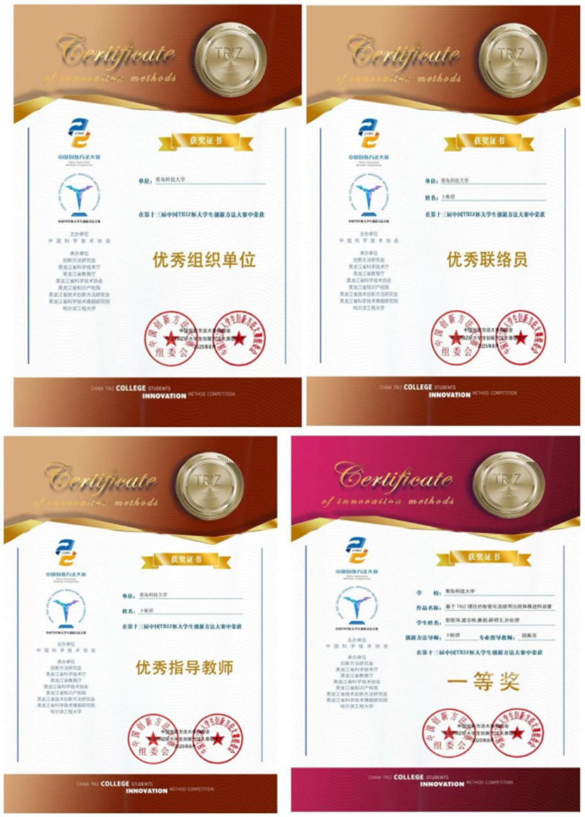 2025年8月28日,第十三届中国TRIZ杯大学生创新方法大赛国赛答辩在哈尔滨工程大学启航中心落幕。青岛科技大学TRIZ创新方法协会代表我校参赛,以“更快更强•多创大奖”为指引,凭借扎实的TRIZ创新方法应用能力与出色的答辩表现,最终共26个作品获奖:1项国一、13项国二、12项国三,获奖数量连续四年位列全国参赛高校前五名。同时我校获评优秀组织单位,协会指导教师卜秋祥副教授获评优秀指导教师和优秀联络员。