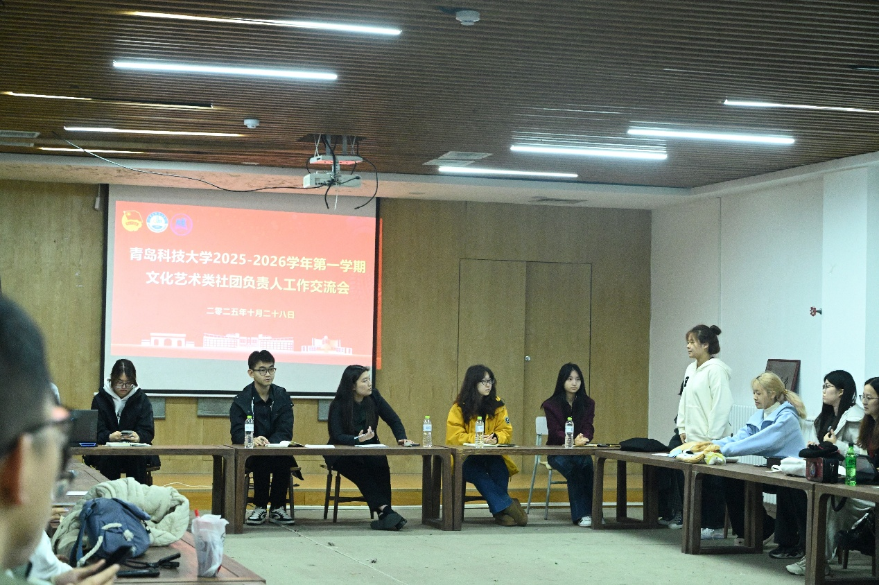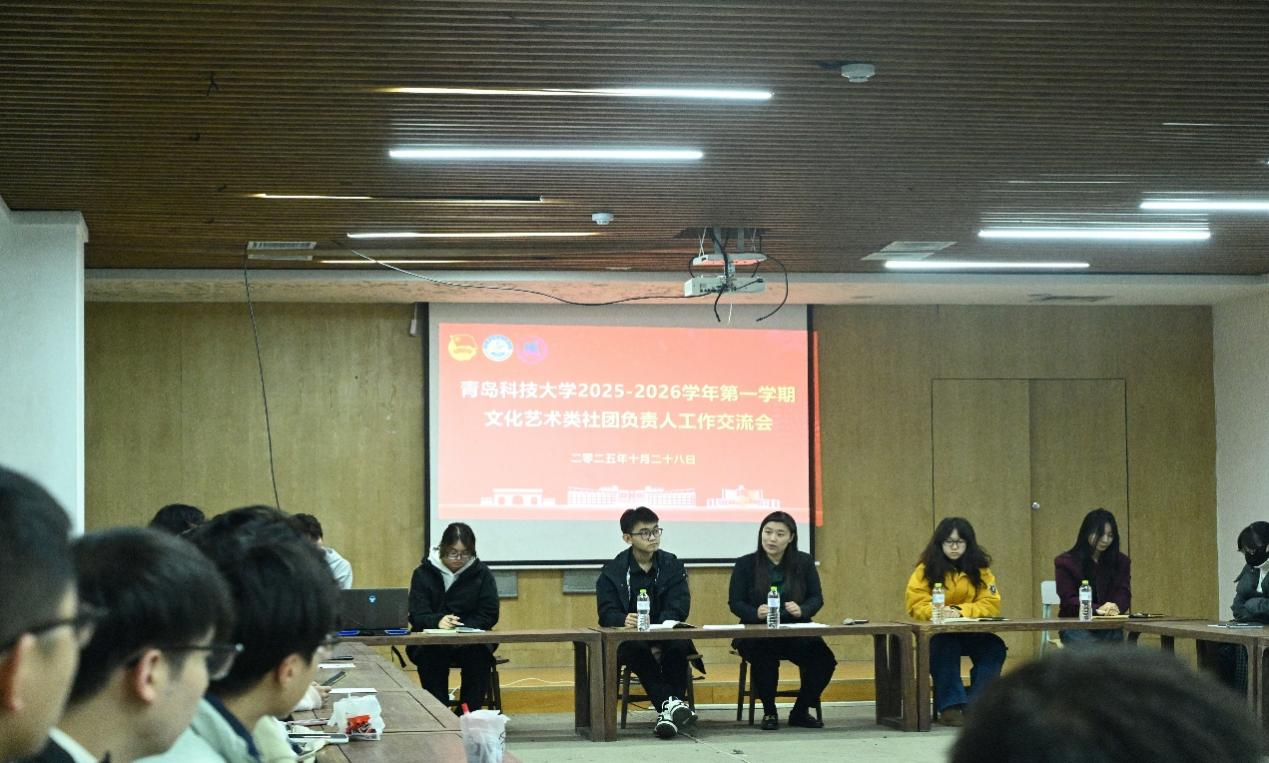近日,学校2025-2026学年第一学期文化艺术类社团负责人工作交流会在崂山校区南区孔子学堂举行。校团委社团管理部部长穆青青老师、文化艺术类社团指导教师王邑及全体文化艺术类社团负责人参与会议。