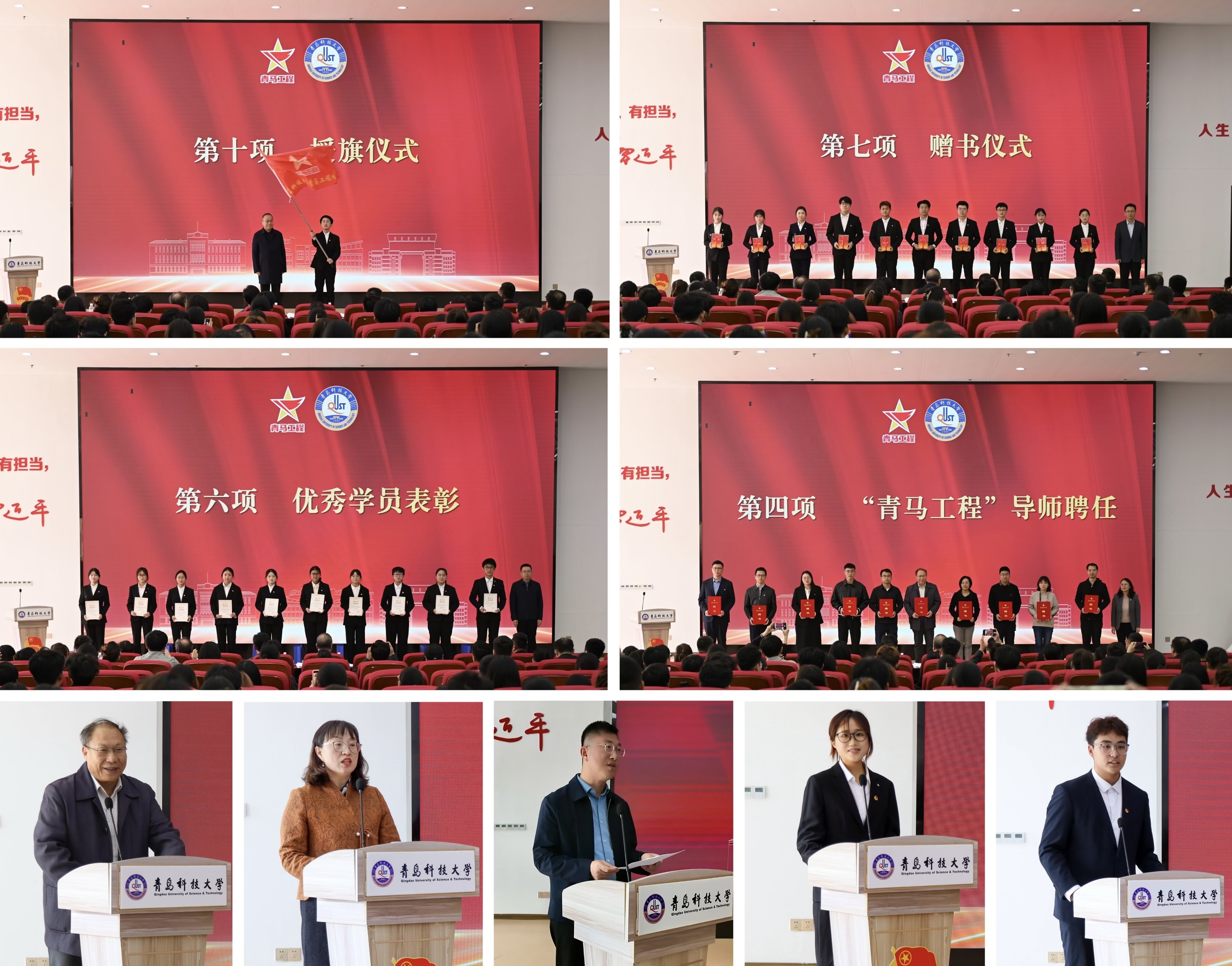 开班仪式上,张洪坤为第18期学员代表赠书;朱敬义为第17期优秀学员代表颁发证书及奖品;马克思主义学院院长曹胜代表导师发言;教务处处长马翠萍为导师代表颁发聘任证书。会上,党委学生工作部部长王丽发布了《关于聘任青岛科技大学第18期“青马工程”导师的通知》,校团委书记刘跃宁就《青岛科技大学第18期“青马工程”实施方案》进行解读,第17期优秀学员代表房玉然和第18期新学员代表李佳潼分别作交流发言。