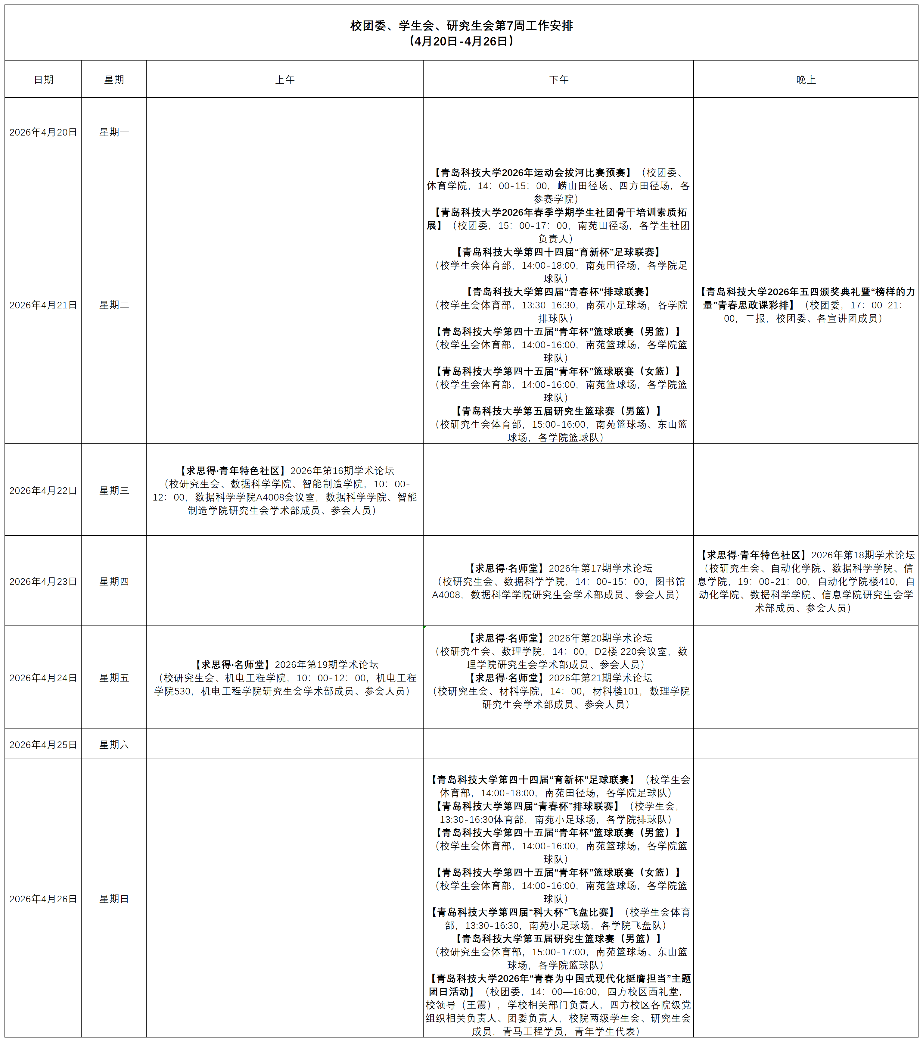 校团委、学生会、研究生会第7周工作安排