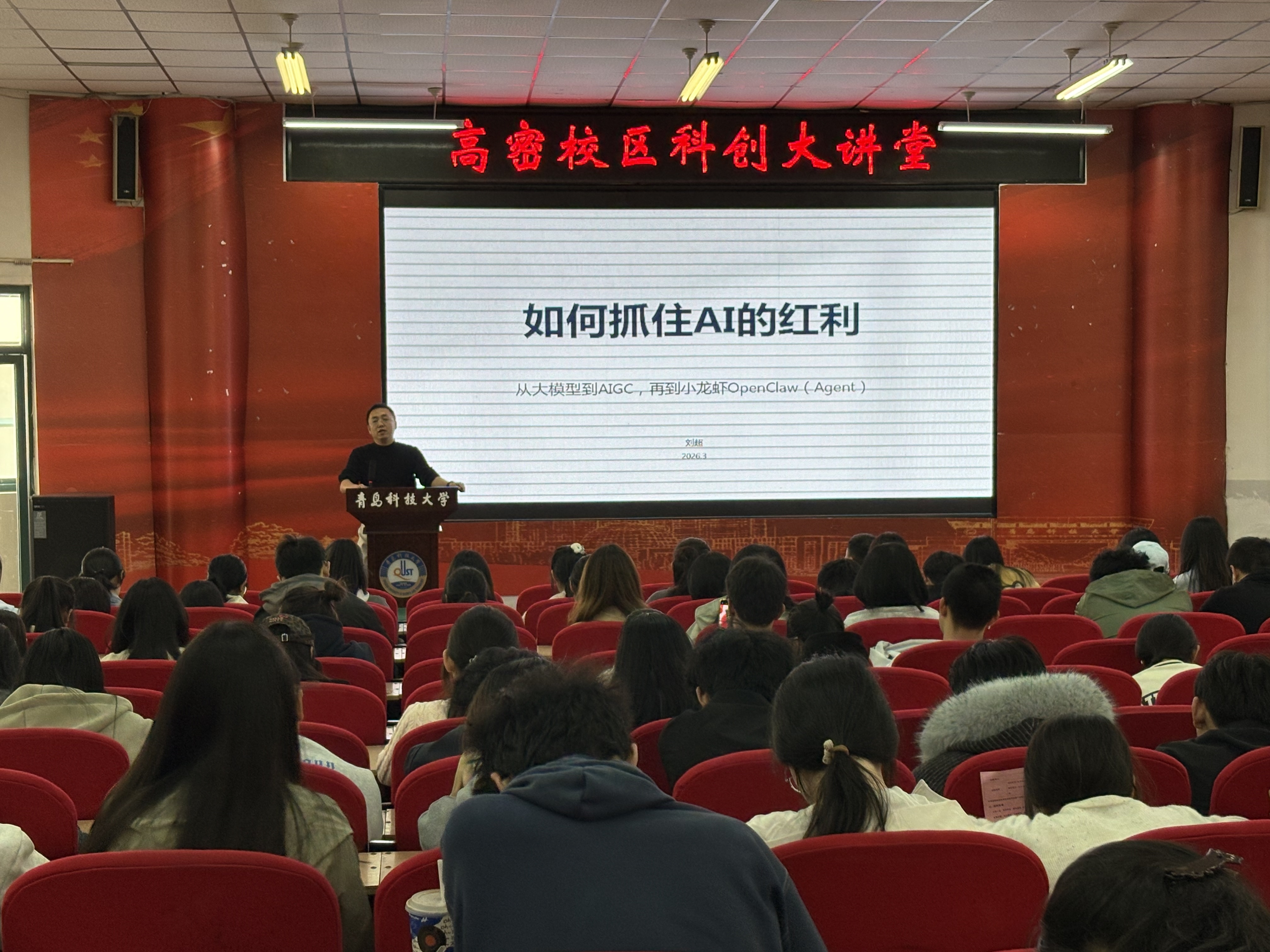 讲座中,刘超以“如何抓住AI的红利”为主题开讲,直击学生日常痛点,拆解了AI在写作、短视频、简历、创业策划等场景的实用解法,系统讲解了LLM、AIGC、Agent等核心概念,梳理了国内外主流AI工具清单,并以简历优化为案例,传授了STAR结构量化成果等AIGC实战技巧,帮助校区青年学子掌握AI工具、抢抓时代机遇。