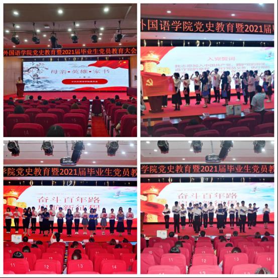 学习百年党史,汲取奋进力量 为教育引导毕业生从党史学习教育中汲取智慧和力量,肩负历史使命,坚定前进信心,外国语学院举办了“奋斗百年路 启航新征程”党史学习教育暨2021届毕业生党员教育大会。学院党委书记曲斌艳以“母亲·英雄·家书”为题,为全体毕业生党员上了离校前的“最后一堂党课”,勉励广大毕业生党员要牢记入党初心,坚定理想信念,立大志、明大德、成大才、担大任,努力成长为合格的的社会主义建设者和接班人。她寄语大家从党史学习教育中汲取智慧和力量、努力奋斗,以实际行动和优异的成绩为党旗增辉,为母校添彩,向党的百年华诞献礼!曲斌艳带领全体毕业生党员面向党旗重温入党誓词,铮铮誓言,让党员们再一次感受党的神圣光辉,更加坚定入党信念和为共产主义事业奋斗终身的决心。学院教工党员代表带领同学们用中、英、德、俄、日、朝鲜语六种语言集体朗读《共产党宣言》,全体毕业生党员集体献词《百年芳华逐梦而行》,铿锵有力的声音带我们回顾了百年来中国共产党带领人民走过的光辉历程和取得的辉煌成就。