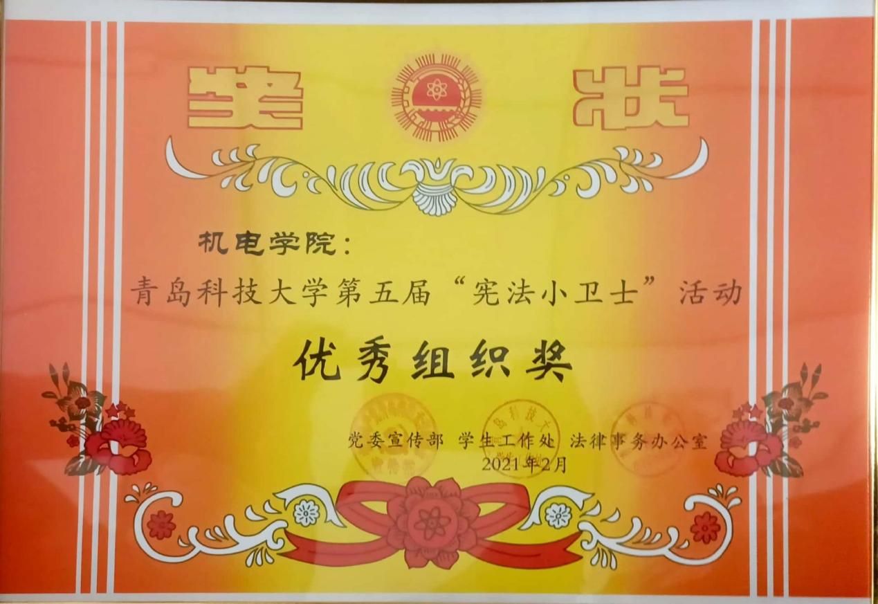 为贯彻党的十九大和十九届二中、三中、四中、五中全会精神,落实全面依法治国方略,引导学生了解宪法知识,理解宪法内涵,机电学院积极组织学院学生参与“宪法小卫士”活动,荣获学校第五届“宪法小卫士”优秀组织奖。