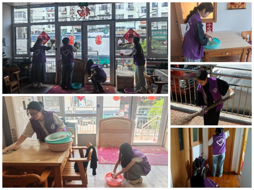 在养老院的实践时光里,团队成员以行动为笔,为这片承载着岁月温度的空间拂去尘埃。在清洁现场,团队成员手持扫帚开展清扫工作,弯腰细致清理走廊、房间角落的杂物与积尘,不放过踢脚线、桌椅下方等易藏污的区域,逐步让养老院公共空间恢复整洁;拖地时,大家双手紧握拖把杆,以均匀力道反复擦拭地面,从边缘向中间推进,待拖把走过的区域水渍慢慢变干,洁净的地面能清晰映出老人们往来的步履;擦拭玻璃时,成员们将抹布对折后轻擦窗户,逐块去除玻璃表面的蒙尘与印记,擦完后开窗通风,让阳光顺利涌入室内,为养老院的房间和活动区增添清朗气息。