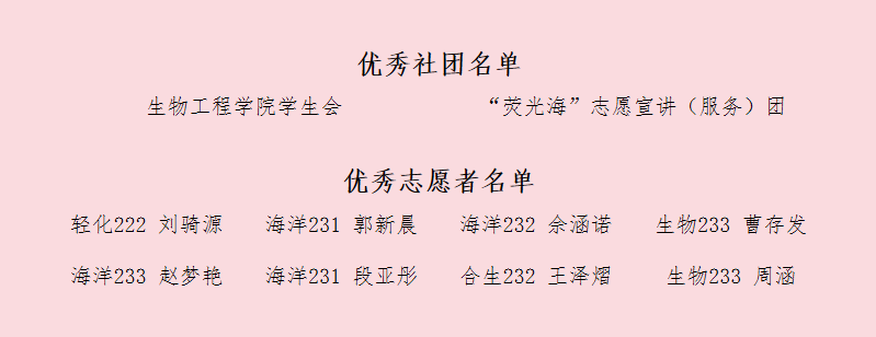 9月28日,由中国环境报社等单位发起主办的第十四届“绿色离校·绿色感恩”全国校园公益行动评选活动结果公布。生物工程学院学生会、“荧光海”志愿宣讲(服务)团获评优秀社团,生物233班周涵、海洋231班郭新晨等8名学生获评优秀志愿者。