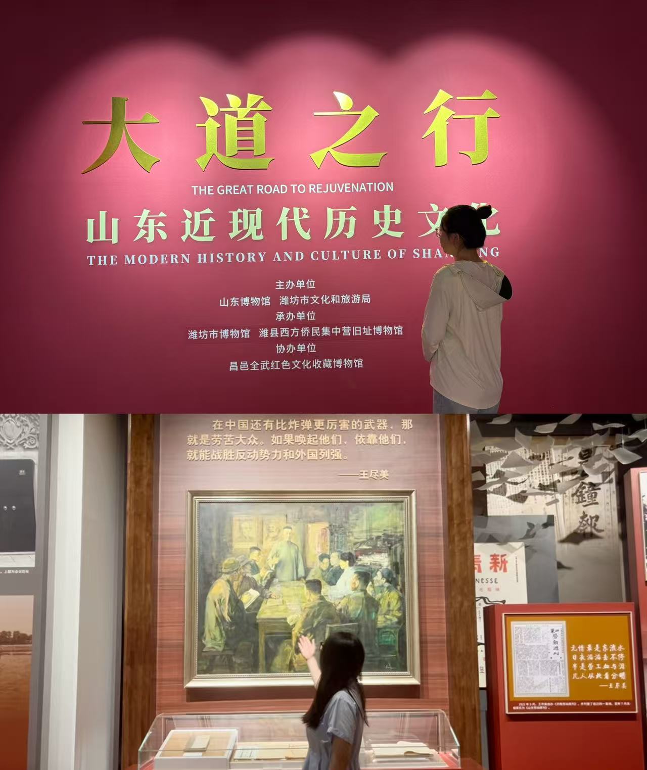 在暑期“三下乡”社会实践活动中,“追溯红色历史,传承红色精神”爱国主义教育实践团带着对红色历史的敬仰与追寻,踏上了前往潍坊市博物馆、沂蒙革命纪念馆的旅程。团员李萍通过实地探访潍坊市博物馆、团员张颖通过探访沂蒙革命纪念馆,共同追寻家乡的红色足迹,学习红色历史,传承红色精神,让红色基因在新时代焕发新活力。通过此次实践,团队成员提升了党性修养、锻炼了实践能力,对党的历史知识和红色文化有了更深的了解,同时也更加坚定了成员争做堪当民族复兴重任时代新人的信心。