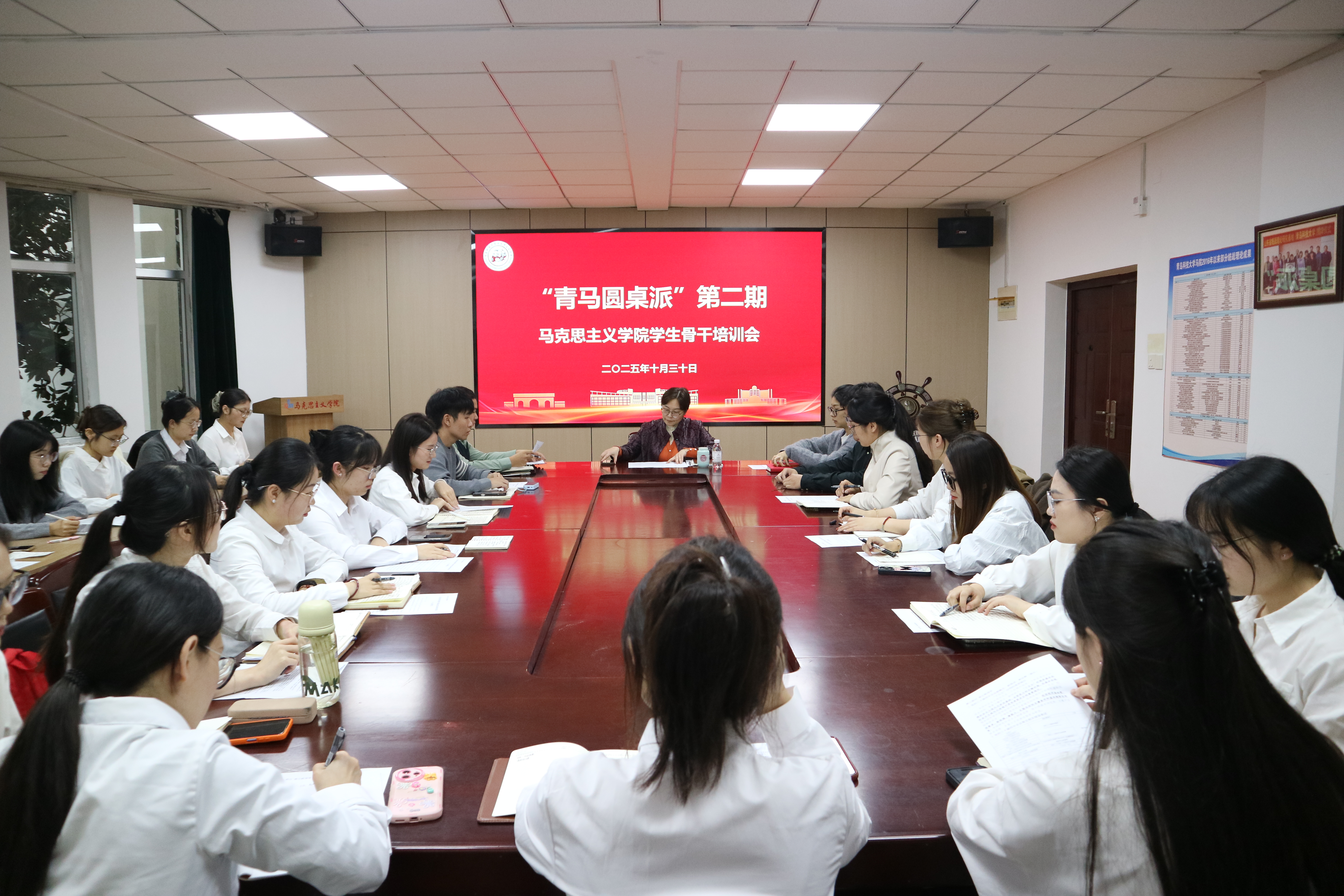 10月30日下午,马克思主义学院“青马圆桌派”第二期学生骨干培训会议于学院2010会议室举行。会议由研究生会执行主席王靖森主持,马克思主义学院党总支书记李卉、学生工作办公室主任郭佩佩出席,研究生会各部门负责人及2025级研究生骨干代表参加会议。