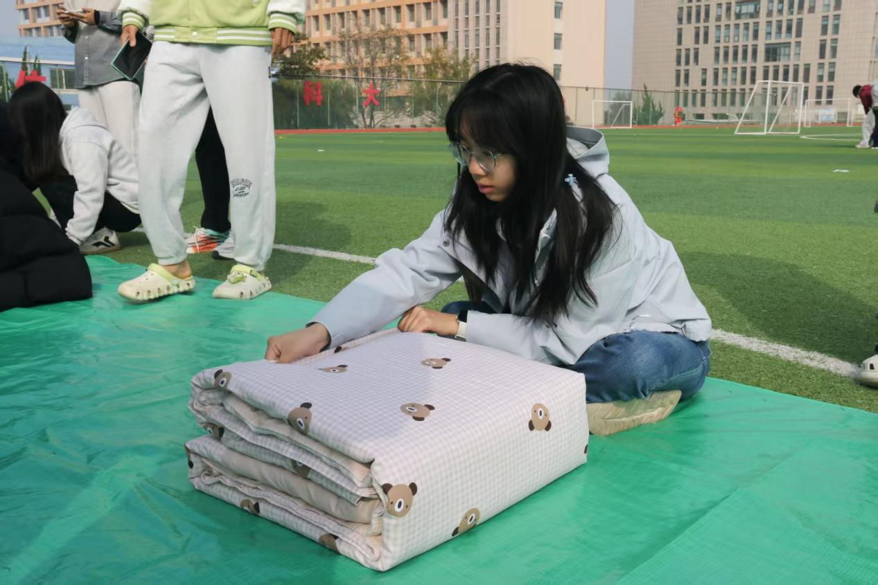 在叠军被比拼中,选手们严谨细致、手法娴熟,铺平、压实、叠角、修边,短短几分钟内,松散的被子变成了整齐的“豆腐块”,展现出同学们良好的生活习惯。