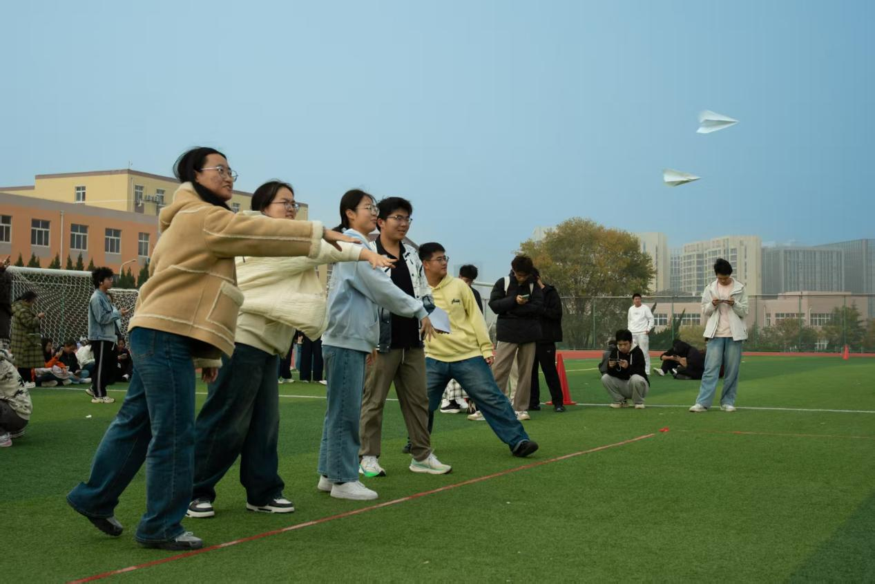 赛场上,各类趣味项目轮番上演、精彩纷呈。在纸飞机大赛中,选手们认真折叠飞机,瞄准目标奋力投掷。