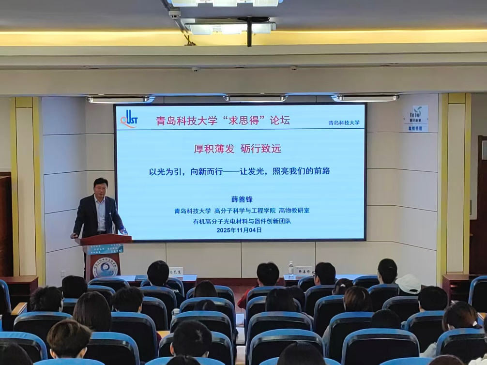 为构筑师生交流纽带,激发科研创新动力,2025年11月4日,高分子科学与工程学院在学院楼401报告厅成功举办“橡尚·导师说”专题报告。本次论坛特邀山东省泰山学者青年专家薛善锋教授作题为《以光为引,向新而行——让发光,照亮我们的前路》的专题分享。