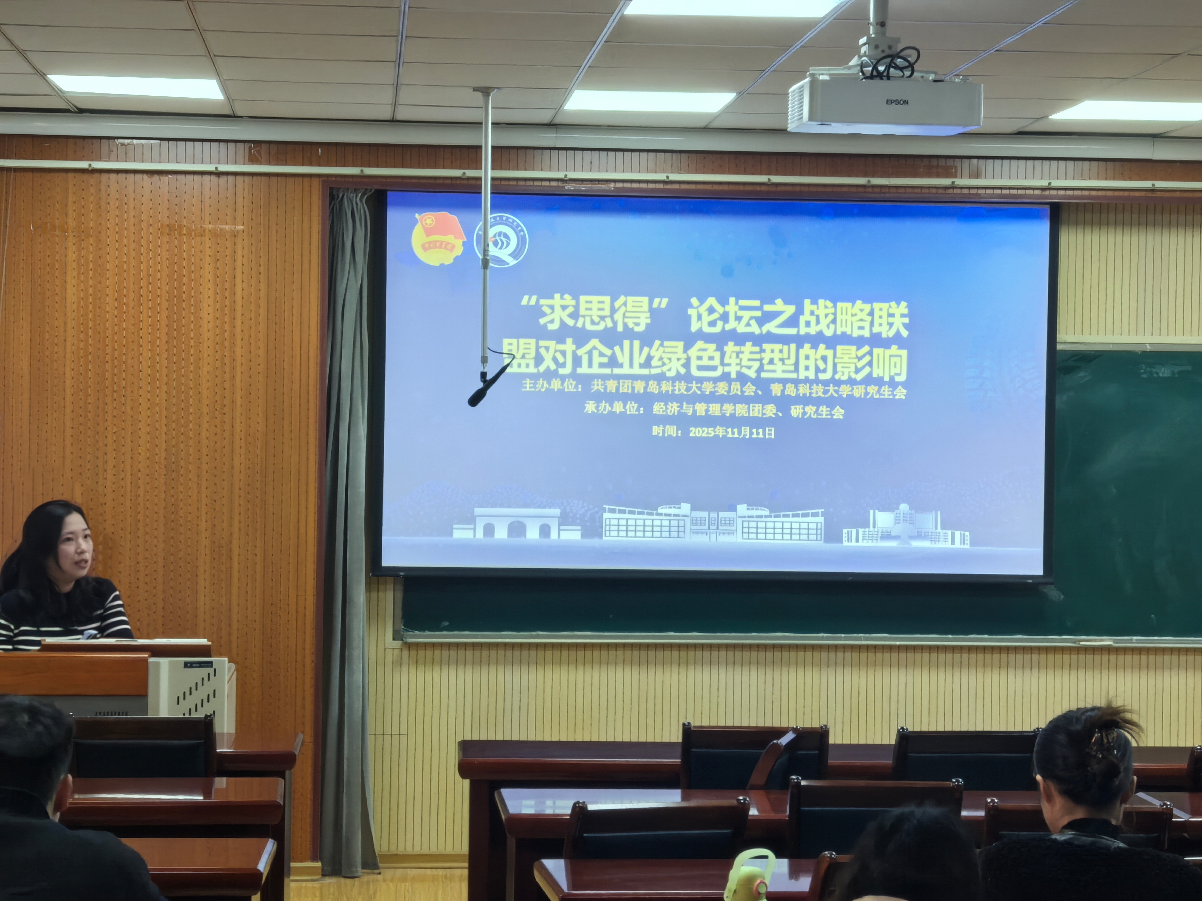 11月11日下午16:00,经济与管理学院团委在经管楼505举行本学期第二次“求思得”论坛,论坛以“战略联盟对企业绿色转型的影响”为主题,邀请了经济与管理学院副教授牛晓童来担任主讲嘉宾,经管学院研究生近百人参加了论坛。