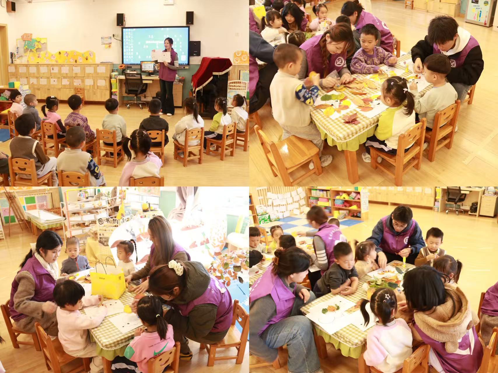 活动现场洋溢着温暖而专注的氛围,志愿者们手把手引导小朋友们兴致勃勃地修剪、拼贴落叶,每一片叶子的摆放都凝聚着孩子们的想象与期待。孩子们眼中闪烁着好奇与喜悦的光芒,有的拼出神气又可爱的小狮子,有的组合成圆滚滚的小刺猬,整间教室充满了亲切的互动与阵阵清脆的笑声。经过近两小时的投入创作,一件件充满想象力、流露童真童趣的落叶手工作品温馨“出炉”。活动最后,志愿者与小朋友手持作品合影,一张张灿烂的笑容定格了这段温暖而有意义的时光。志愿者们专注而亲切的陪伴,赢得了幼儿园老师与孩子们的一致认可。