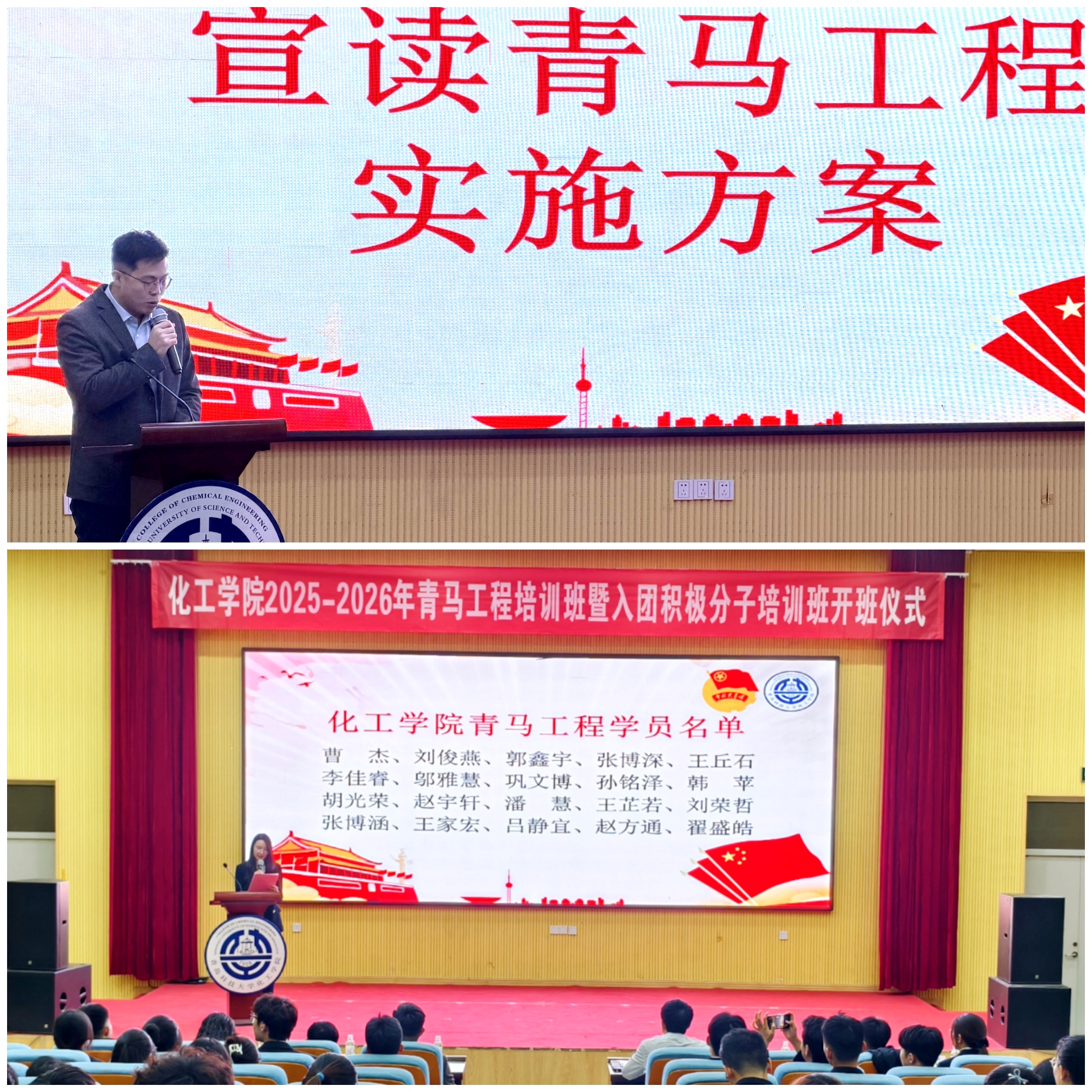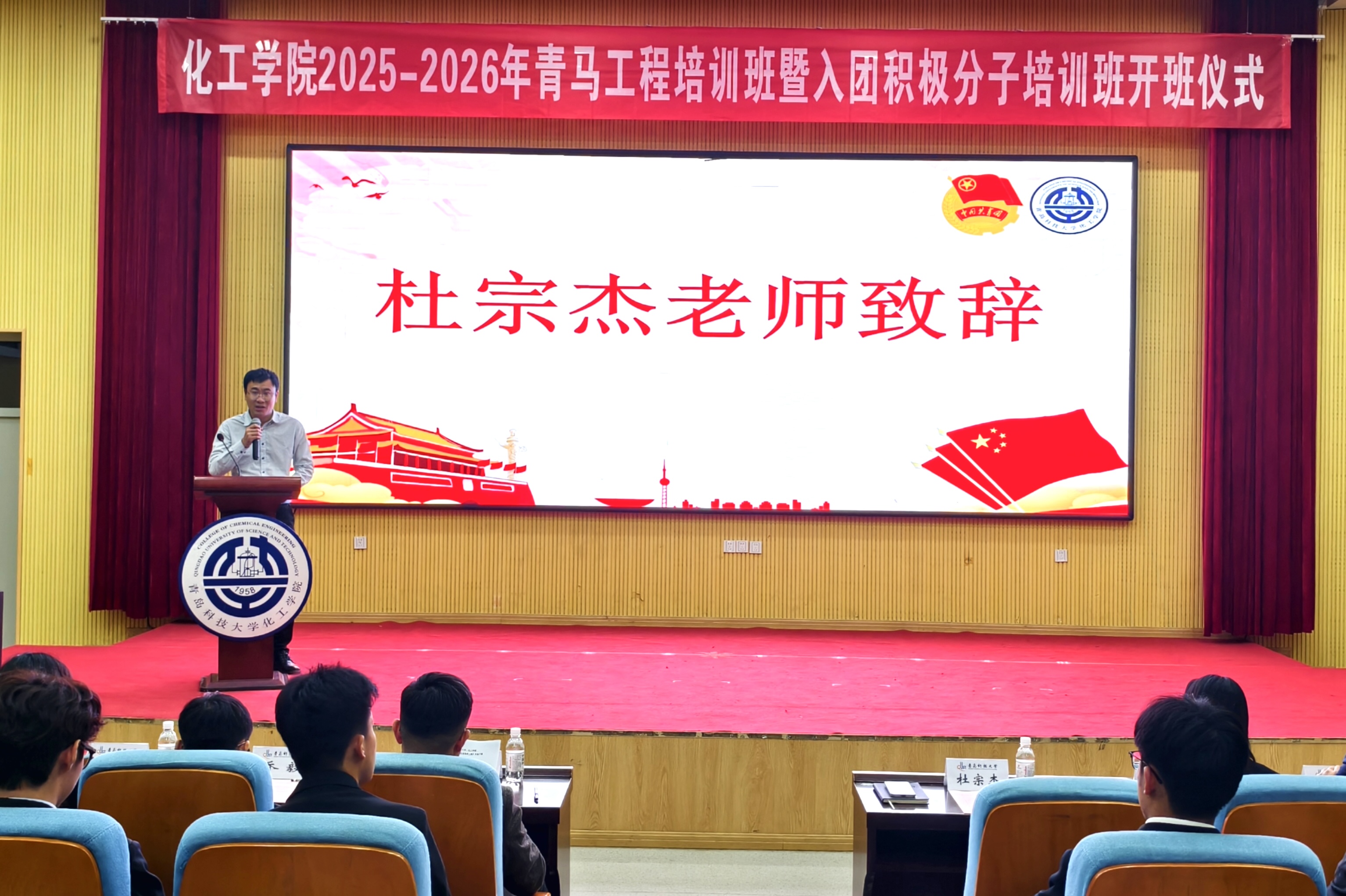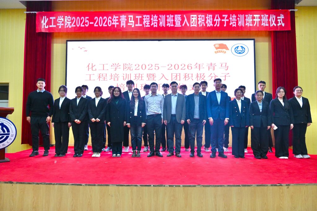 为深入学习贯彻党的二十届四中全会精神,全面落实共青团中央关于实施“青年马克思主义者培养工程”的部署要求。11月18日下午,化工学院团委在尚舜报告厅举行2025-2026年青马工程培训班暨入团积极分子培训班开班仪式。化工学院团委书记杜宗杰、化工学院团委副书记柳晓阳、殷佳珞,各年级辅导员、青马学员、入党积极分子、入团积极分子以及2025级团支书参加了本次活动。
