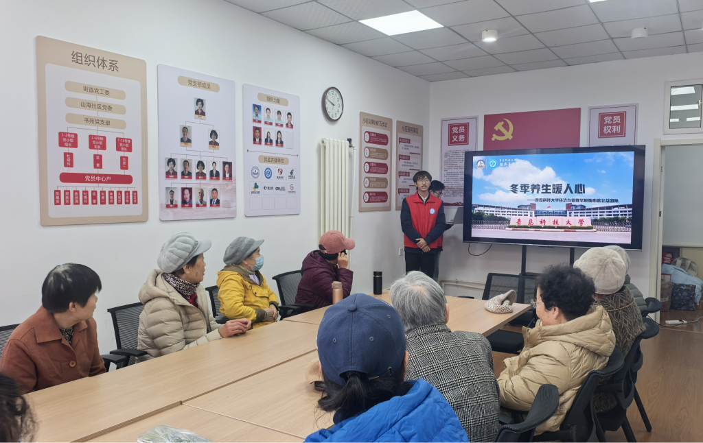 为响应健康中国建设和“百万大学生进社区”号召,切实满足社区居民冬季养生保健需求,让实用养生知识走进社区、惠及群众,11月22日,青岛科技大学经管学院暖心愿公益团队走进青岛市崂山区山海社区开展“暖冬养生行,健康伴你行”养生科普志愿实践活动,将防寒保暖、饮食调理、慢病预防等干货内容与互动实操相结合,为社区居民送上一份贴心的“冬季健康指南”。
