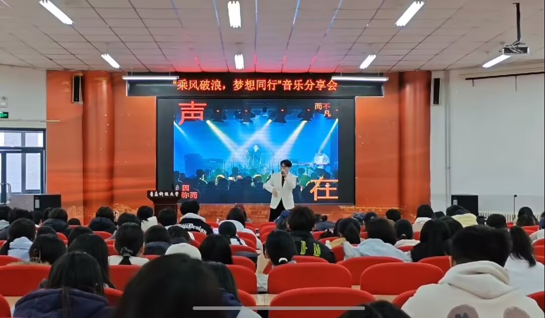 为丰富校园文化生活,发挥杰出校友的榜样引领作用,2025年11月25日,高密校区在通德会堂举办“乘风破浪,梦想同行”音乐分享会。本次活动特邀我校优秀校友、音乐人李宗锦(松紧先生)担任嘉宾,师生代表百余人齐聚现场,共同聆听成长故事、交流行业见解、感受音乐魅力。