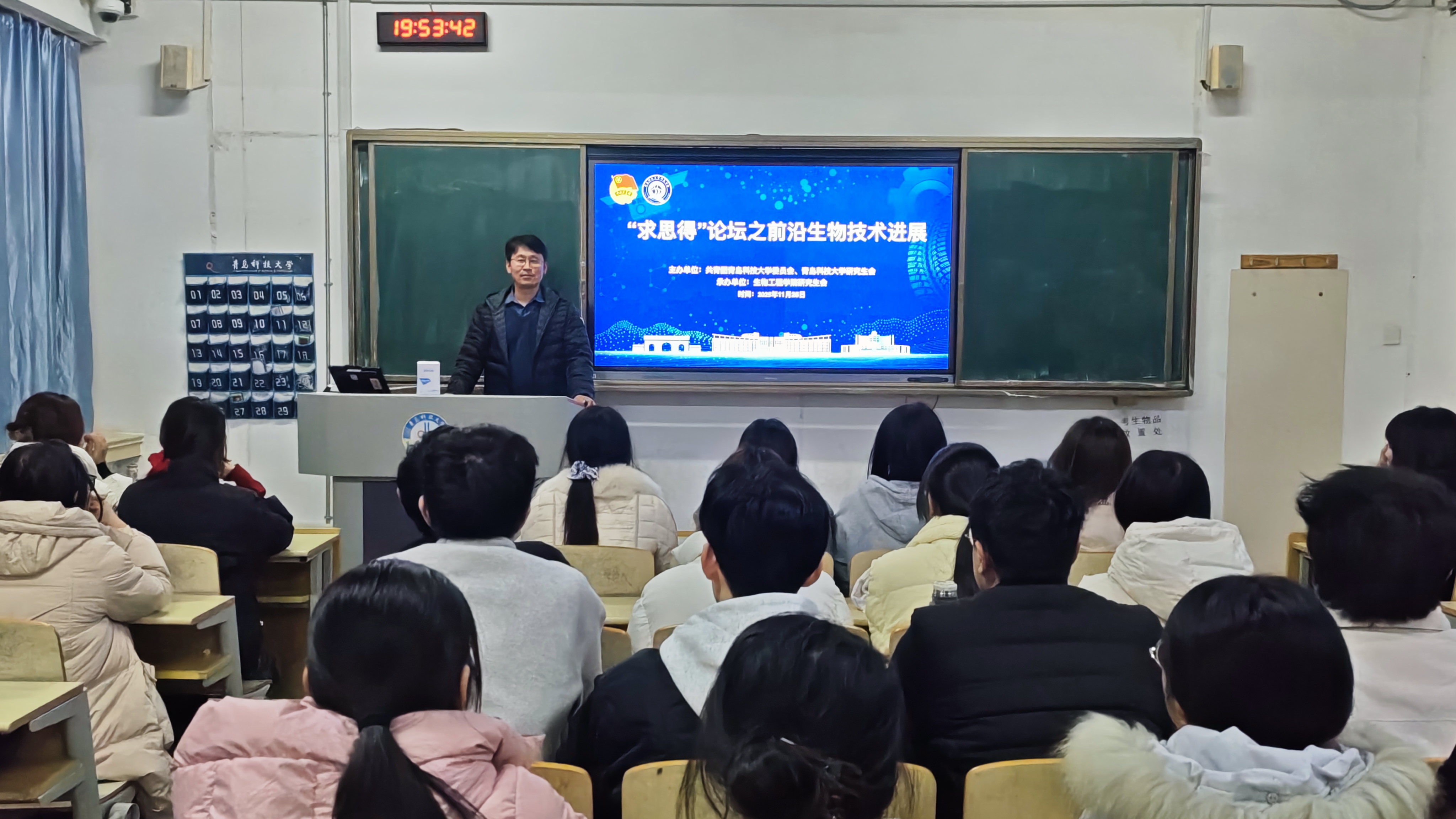 11月25日,生物工程学院团委在第二教学楼301教室举行“求思得”论坛——前沿生物技术进展,邀请学院院长顾玉超教授担任主讲嘉宾,系统解读基因编辑、重组蛋白药物、抗体药物等关键技术的研发进展与应用前景。学院90余名研究生参加论坛。