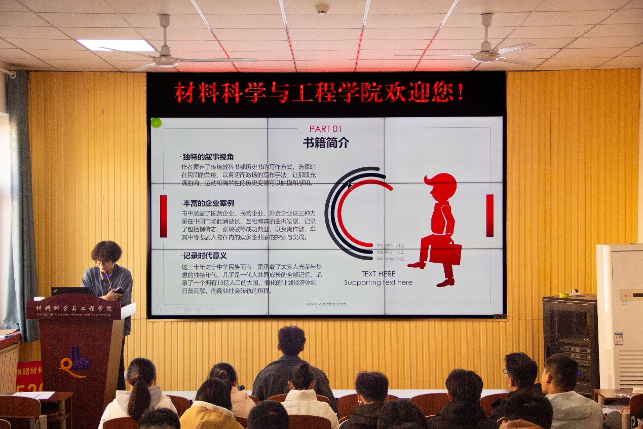 为营造良好的学习交流氛围,拓宽知识视野,促进思想碰撞,材料学院团委于11月25日下午在学院楼101开展了主题为“破立交织,野蛮生长”的读书分享会,由徐大林同学为在场听众分享了吴晓波创作的书籍《激荡三十年》。