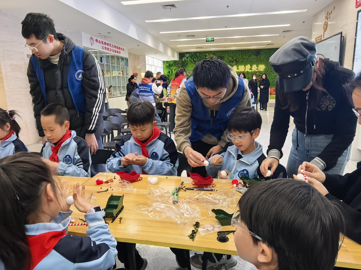 在手工实践环节,志愿者们发挥专业所长,进行雪人小手工制作示范,指导学生完成材料拼接、细节装饰等步骤。孩子们踊跃参与、创意十足,在动手实践中直观感受“冬韵”的美学内涵,一件件充满童趣的作品成为节气文化具象化的生动载体,现场氛围热烈而温馨。