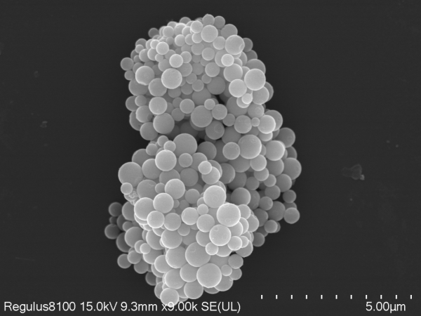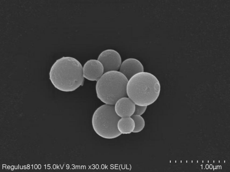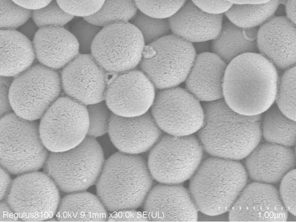 这是金黄色葡萄球菌的扫描电子显微镜成像。金黄色葡萄球菌是革兰氏阳性菌,球形,常呈葡萄串状排列。此图呈现其微观形态,菌体表面有特征性纹理,个体间相互堆积。作为重要条件致病菌,它可引发皮肤感染、肺炎等多种疾病,SEM图像助力研究其形态结构与致病机制,在微生物学研究、临床病原识别等领域意义关键,为解析细菌特性及防控相关感染提供直观依据。