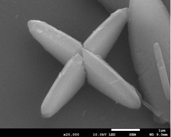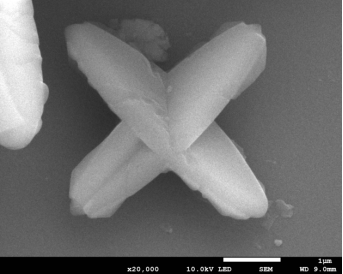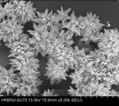 拍摄材料:硝酸钴与二甲基咪唑合成的Co-MOF,电镜下呈现规整十字架微观形貌,体现MOF材料的结构可控性。
