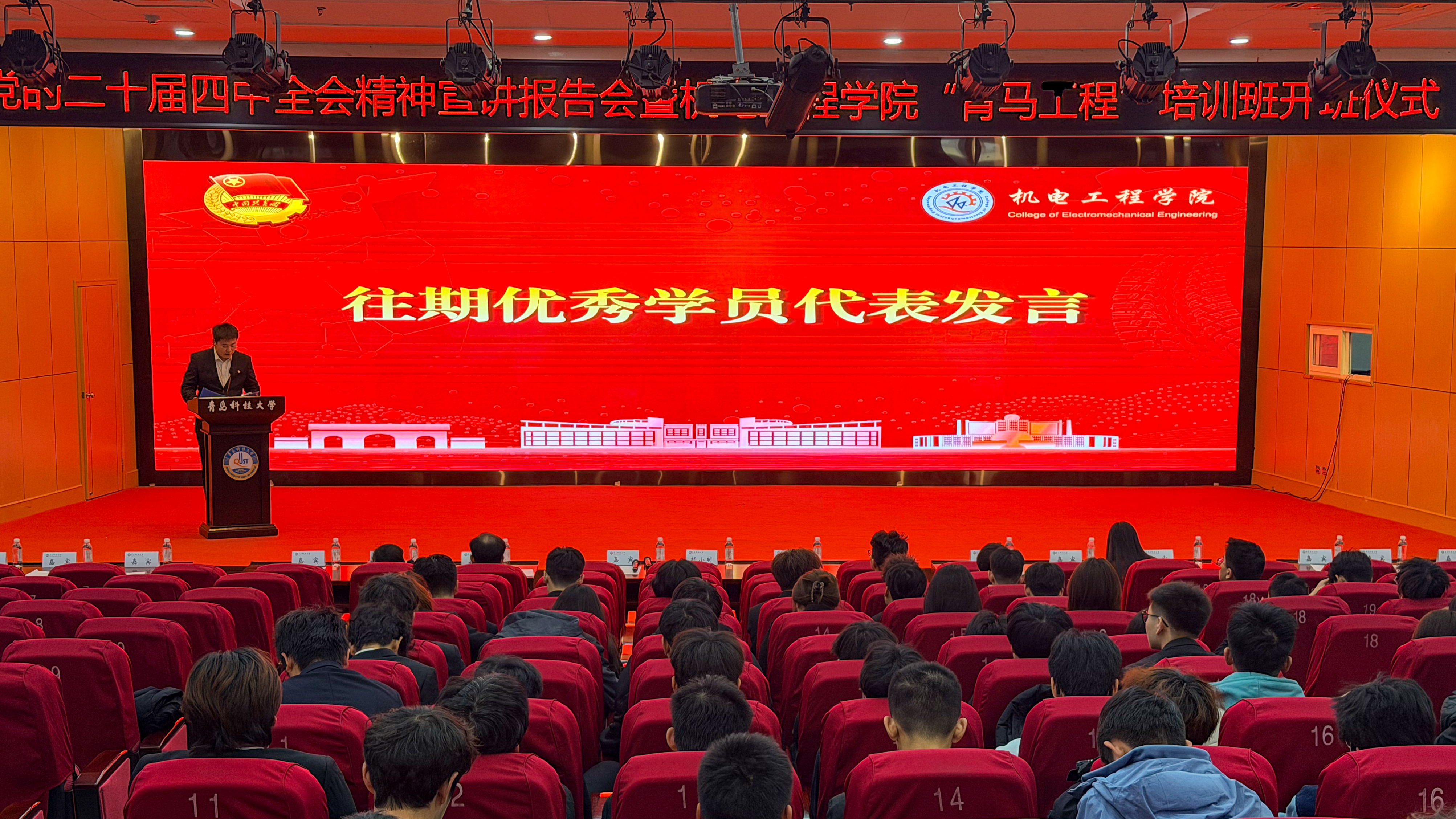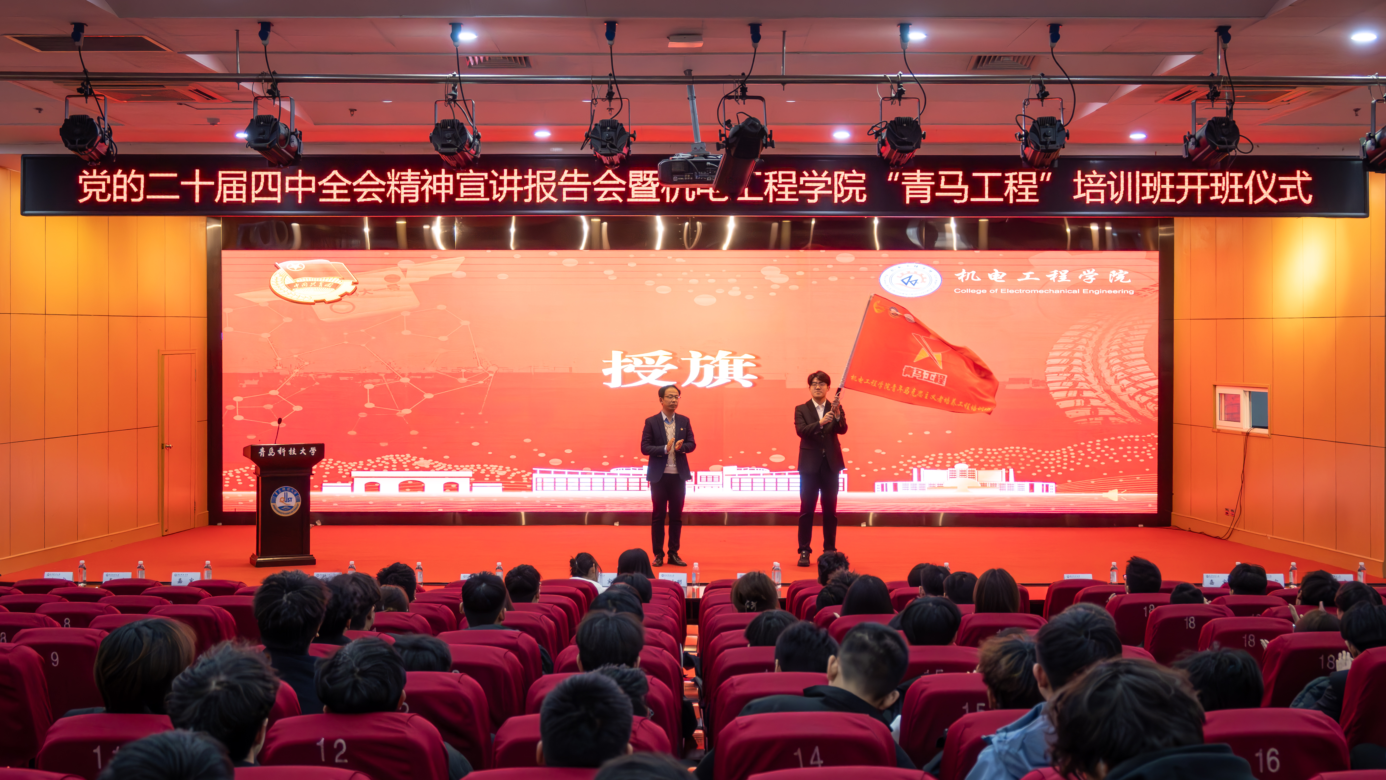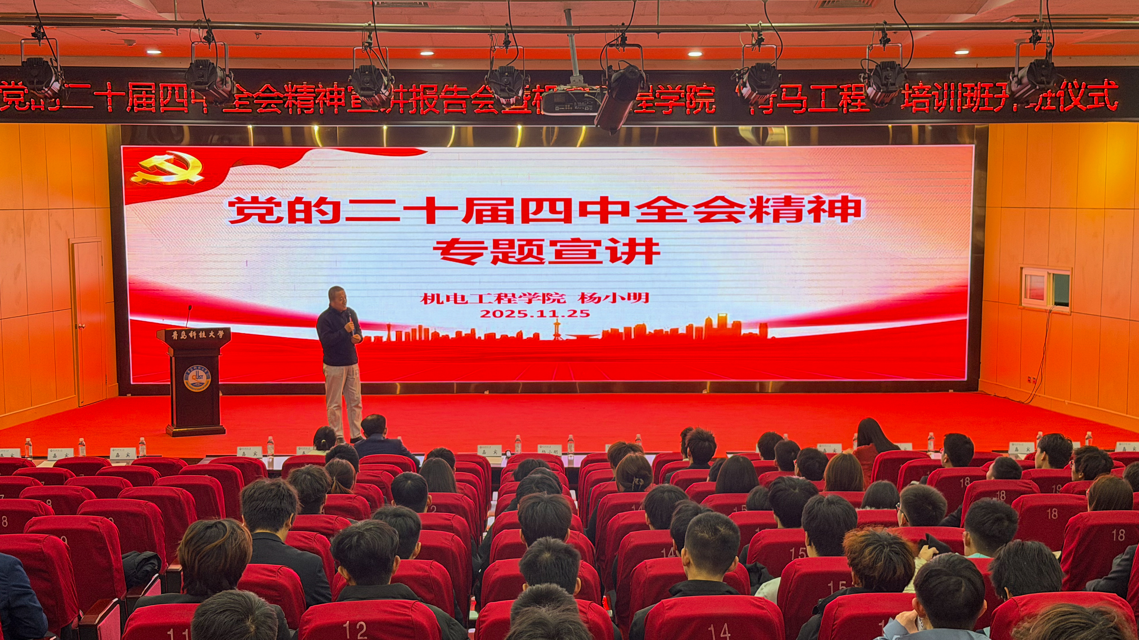 为深入学习贯彻党的二十届四中全会精神,扎实推进青年马克思主义者培养工作,机电工程学院于11月25日举办党的二十届四中全会精神宣讲报告会暨2025-2026学年“青马工程”培训班开班仪式。机电工程学院党委副书记兼副院长杨小明以及学院全体专兼职团干部,青马工程培训班学员、团校学员代表参与本次会议。开班仪式由学院团委副书记李慧敏主持。