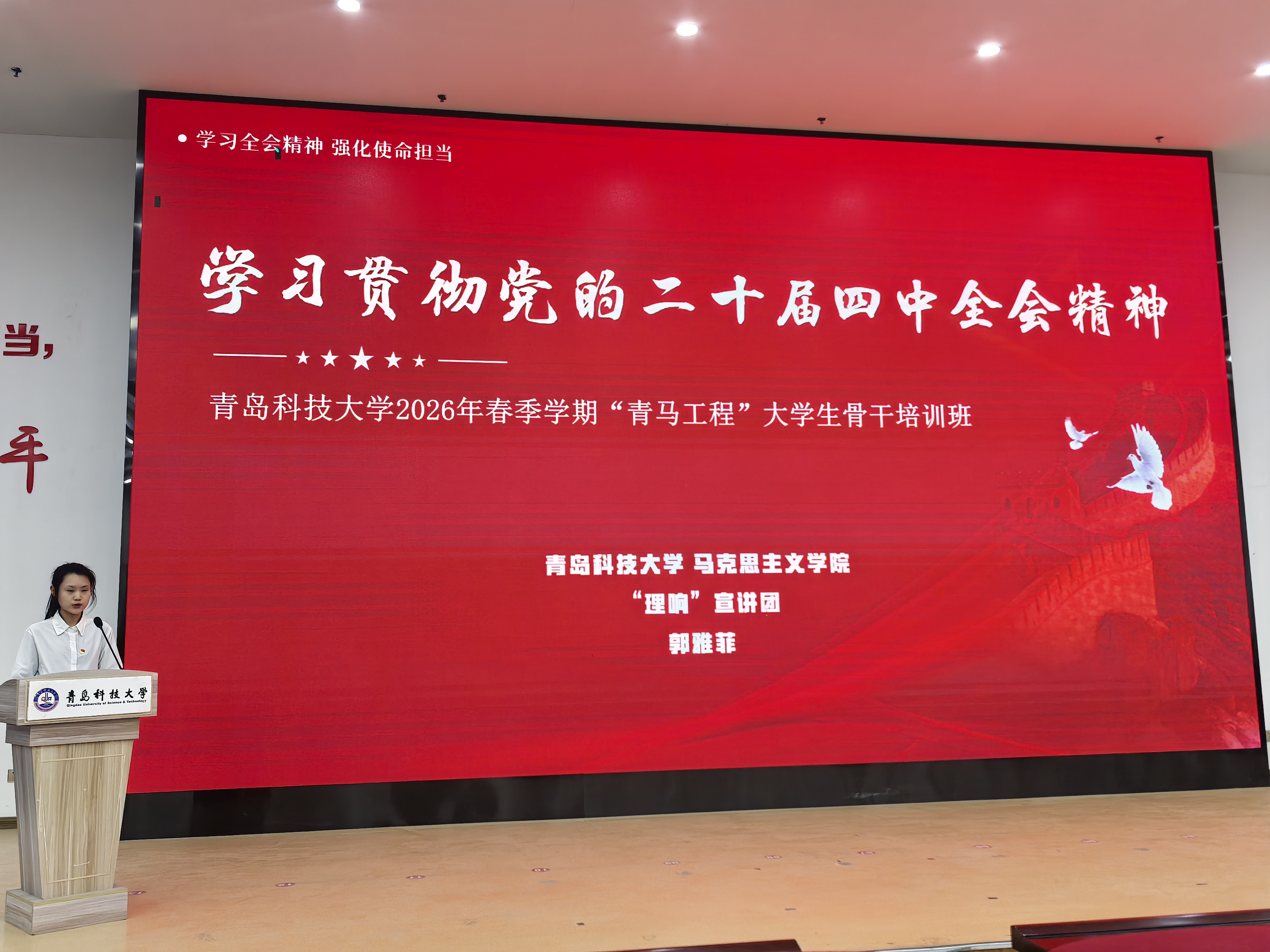 郭雅菲以《学习贯彻党的二十届四中全会精神》为主题进行宣讲。她围绕全会的重要意义和主要内容,对相关精神进行深入解读,并结合新时代青年肩负的时代使命,引导同学们深刻认识新时代发展目标与青年责任。宣讲内容紧密联系实际,进一步加深了参训学员对全会精神的理解与认识。